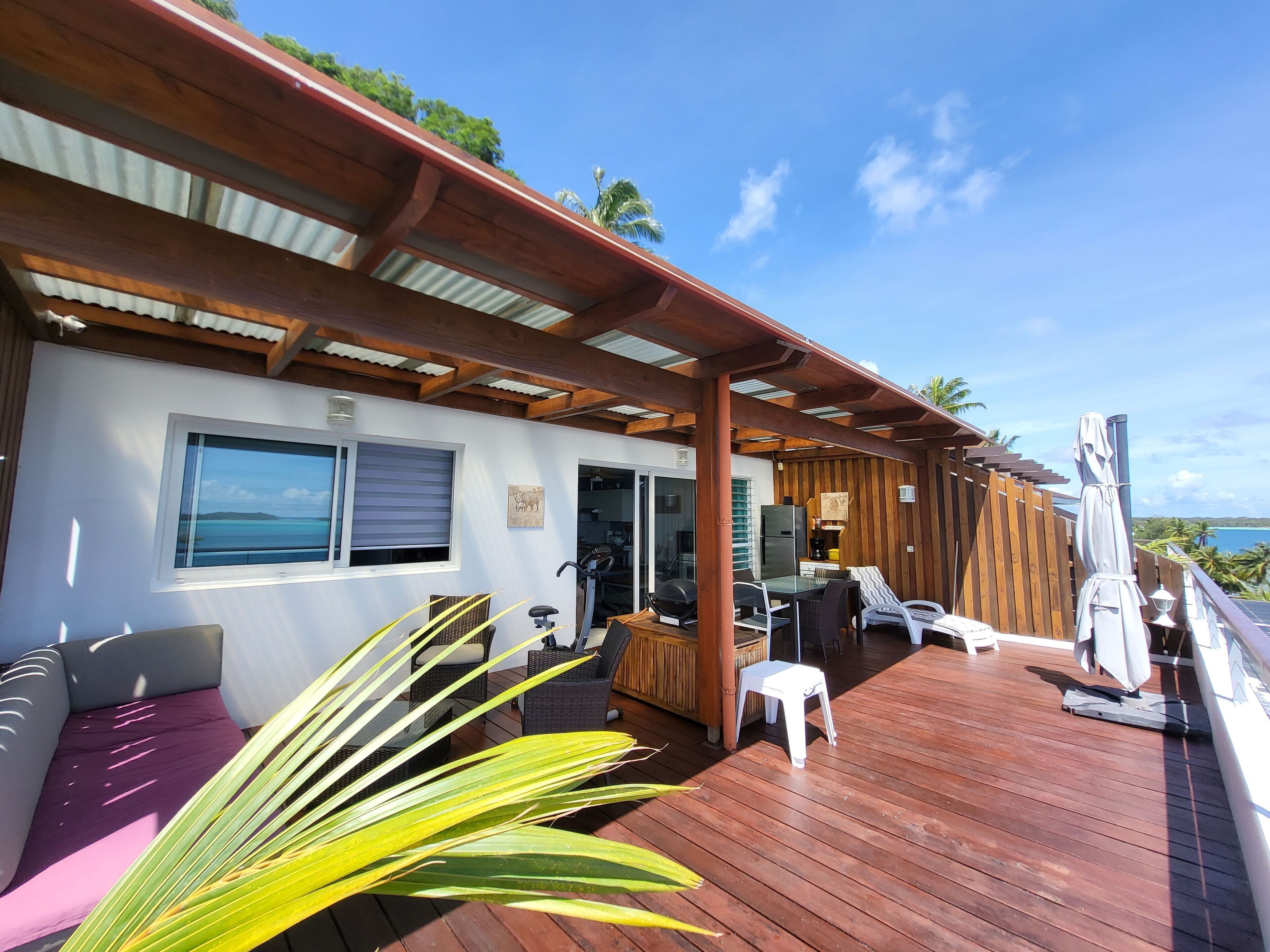 We offer you a very pleasant apartment (55 m2) with a large covered terrace (14 m2) that will allow you to have your meals, or sunbathe (morning) and enjoy the shade in the afternoon. A nice view of the mountains (Mt Pahia 621m as well as a small view of the lagoon.