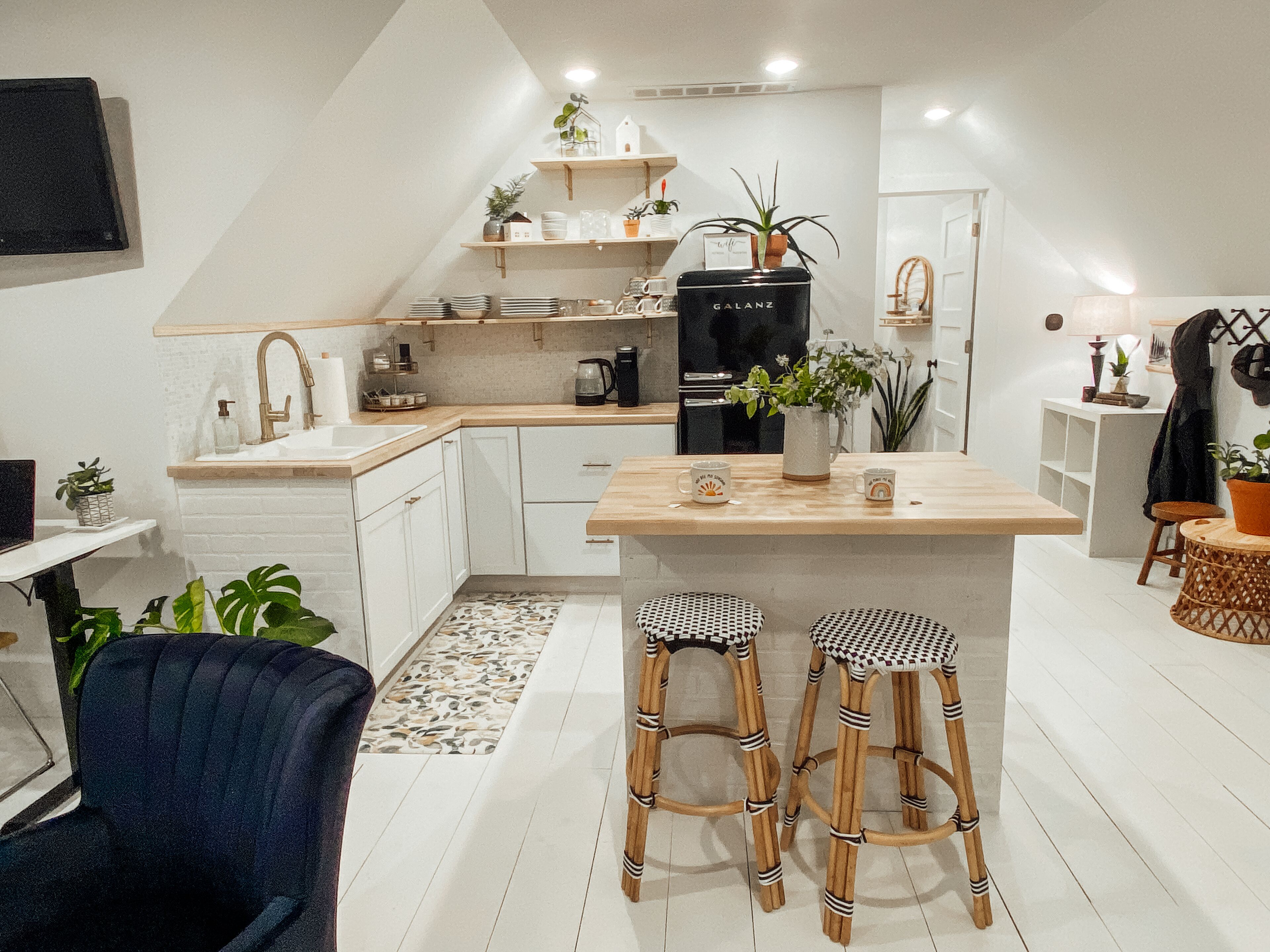 It also has a kitchenette with a microwave but no standard stove. There is an air fryer, full-size refrigerator, coffee bar, and washer and dryer.
