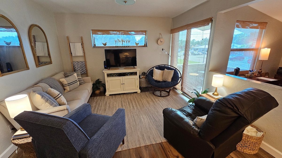 Our Suite is strategically located, just 5 miles from Anna Maria Island Gulf Beach. Near a host of attractions and activities. The spacious 32 x 12 suite, adorned with blue blackout draperies, features a new queen sized bedroom, a living room with twin reclining loveseats, and a small kitchenette for non-cooking purposes. The full private bathroom is equipped with a linen closet, bathtub, shower, beach towels, and toiletries. Entertainment is provided by a TV with Alexa Fire Stick, offering Prime, Disney+, Hulu, and local/world news and weather updates.