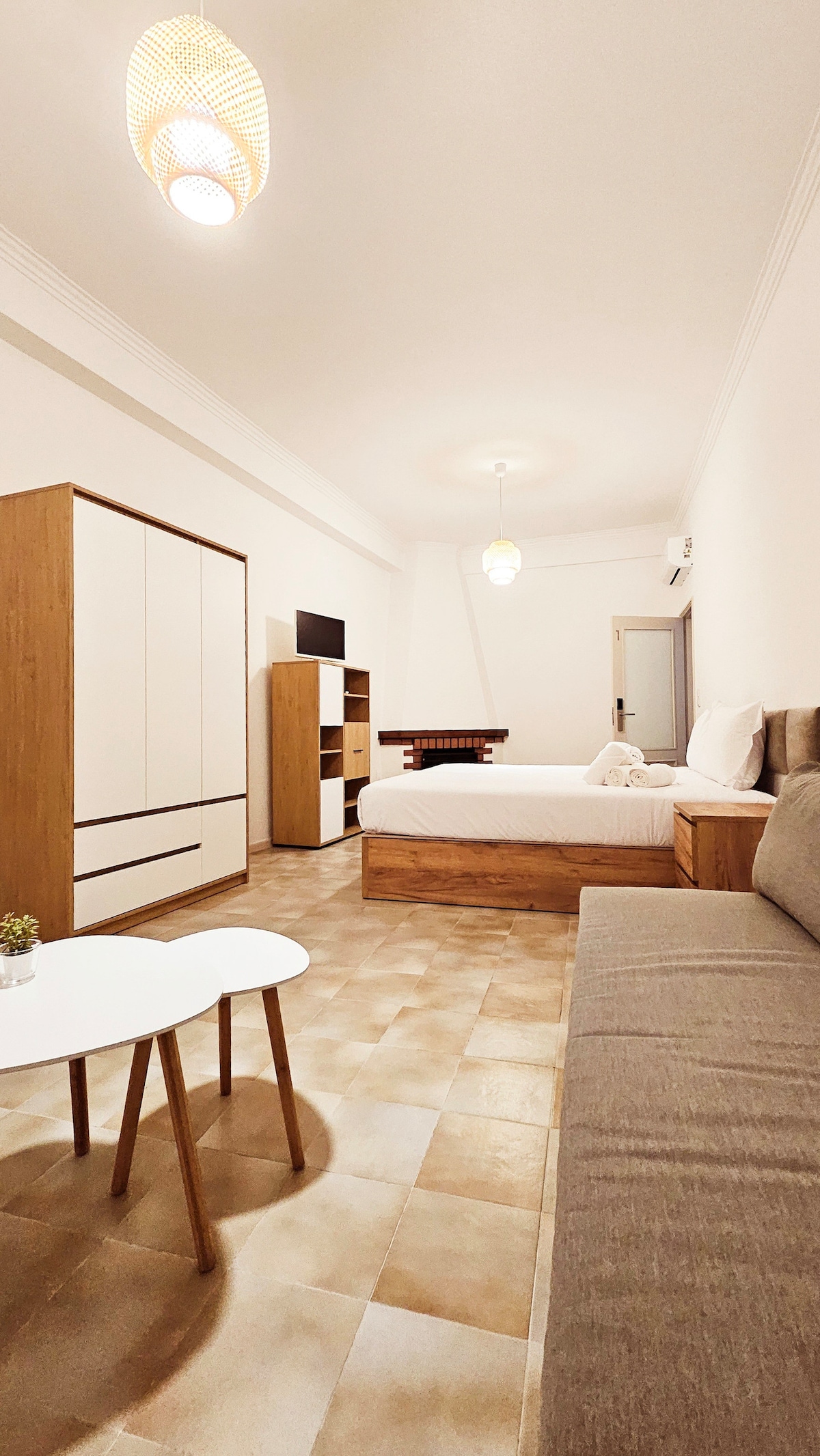 The entire group will enjoy easy access to everything from this centrally located space. Super spacious room with fireplace, inverter air-conditioning, super fast internet. It has two single beds that can join together and stay an extra large double bed. It also has a sofa bed that can be used. That is, you can sleep a couple in the double bed and one child, or two on the sofa bed, or two people in the two separate beds, plus on the sofa bed.