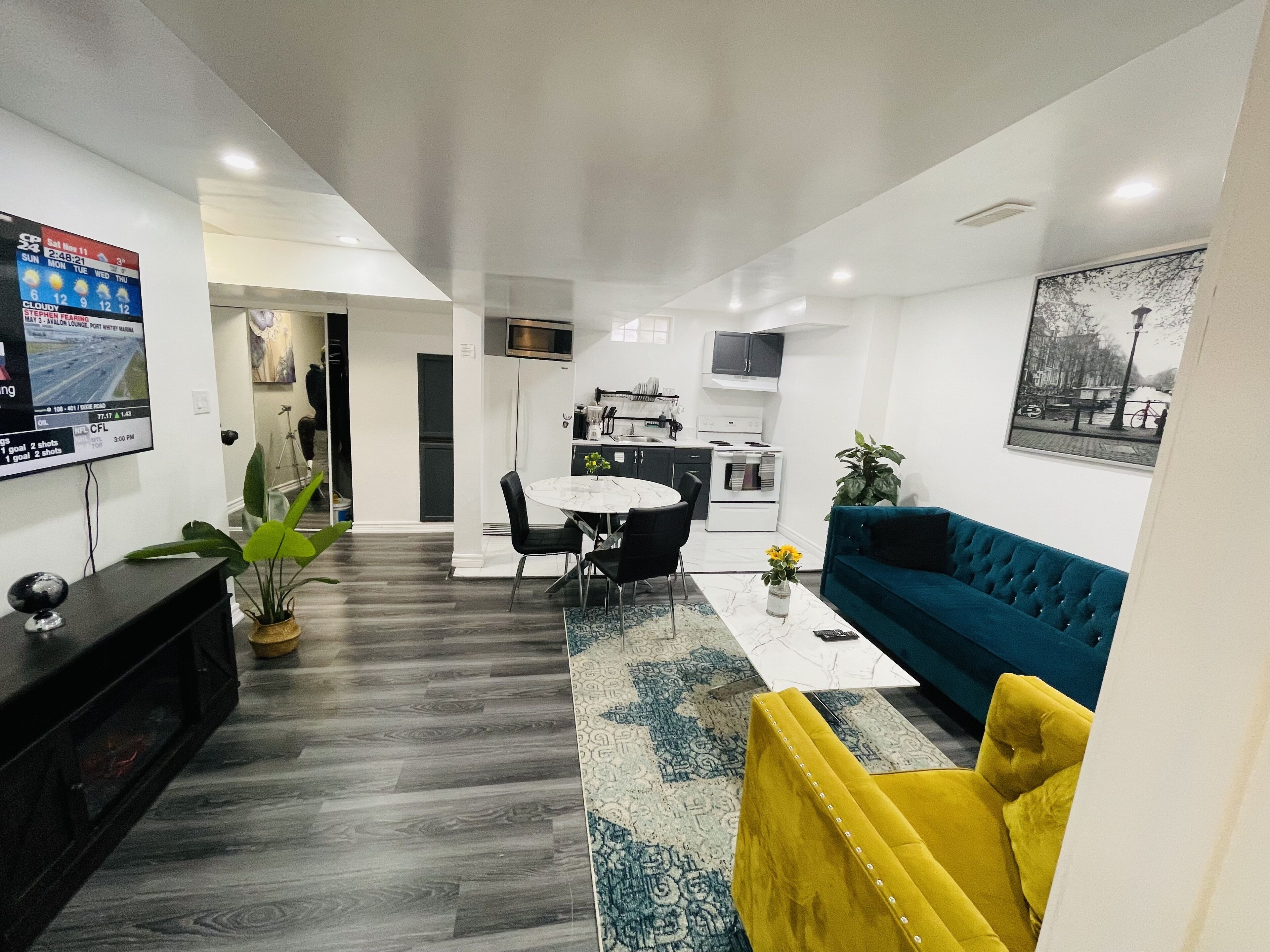 Welcome to this cozy, fully furnished 1-bedroom basement suite! Perfect for travelers, couples, or business stays, it offers a comfortable king bed, a modern living area with a flat-screen TV, and a fully equipped kitchenette for your convenience. The private bathroom includes fresh towels and a walk-in shower. Located in a quiet neighborhood with free street parking, it's close to public transportation and local attractions.