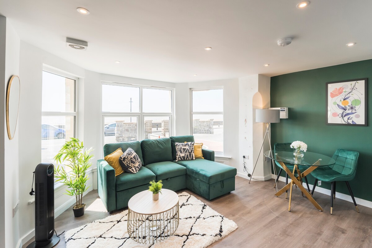 Private Living Space: A cosy living room with a sofa bed and stunning sea views from the bay windows.