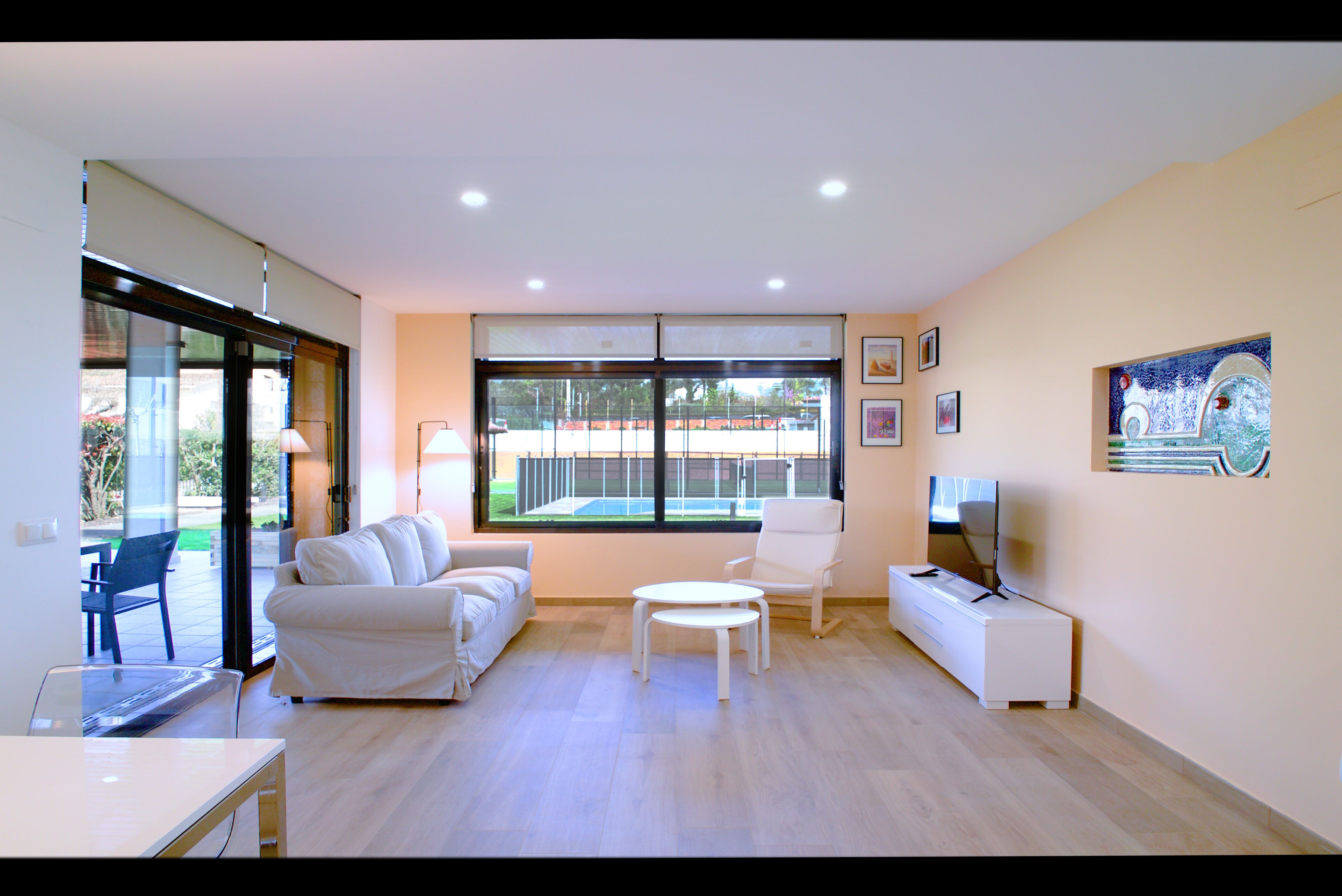 Tourist apartment of 57m² located on the ground floor of the building, with living-dining-kitchen, double bedroom, bedroom with two single beds and bathroom. Private outdoor terrace overlooking the communal garden and pool. Heating-air conditioning. Fully equipped with ceramic hotplate, microwave, refrigerator, dishwasher and Smart TV 50". Magnificent view of the Montsoriu Castle.