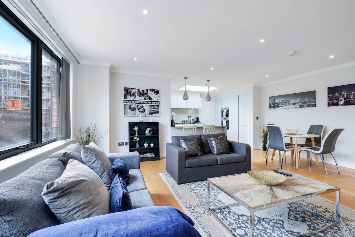 Experience pure luxury in this stunning 2-bed apartment. This exceptional property features an open-plan living/kitchen/dining room, a modern bathroom with walk-in shower & deep soaking Japanese bath, 2 kingsize bedrooms and a versatile garden studio which can be used as a 3rd bedroom (extra cost per person), or a dedicated workspace/utility. Bi-fold doors seamlessly connect the living area to a small garden for an indoor-outdoor lifestyle. Enjoy underfloor heating, AC, & high-tech amenities.