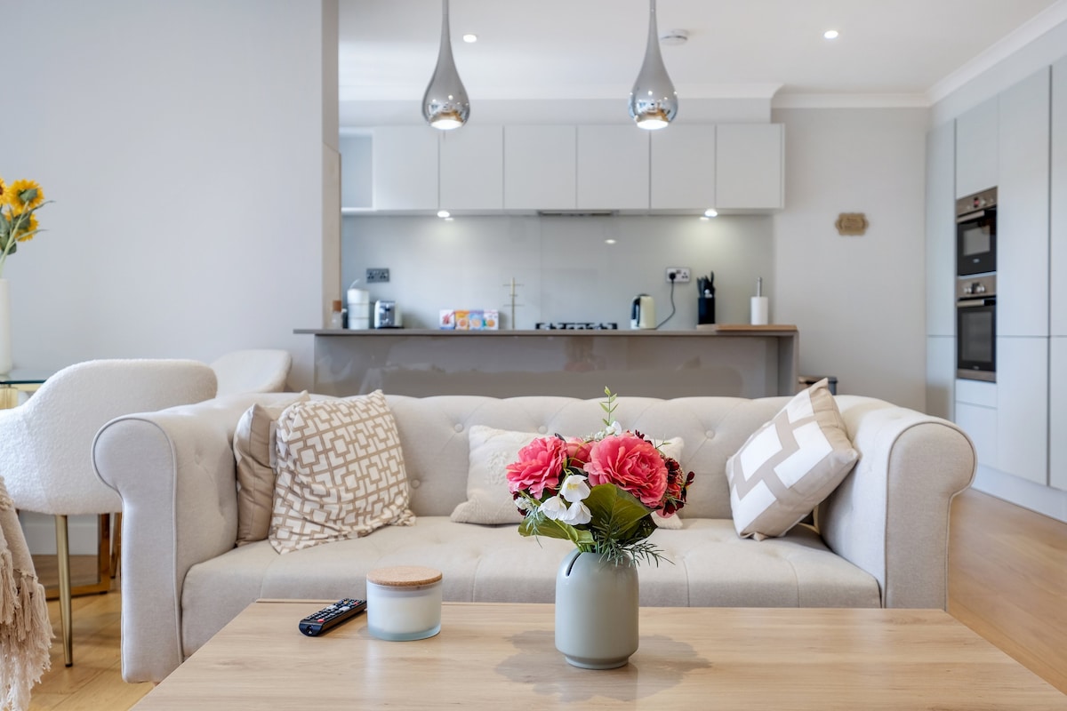 Welcome to our charming 2-bedroom riverside apartment in Brentford! This cosy retreat features a spacious living area with stunning river views, a fully equipped kitchen, and a private balcony for relaxing moments. The master bedroom has a queen bed, while the second bedroom offers two twins, ensuring comfort for all guests. Enjoy nearby cafes, restaurants, and scenic river walks or take a short train ride to central London for famous attractions.
