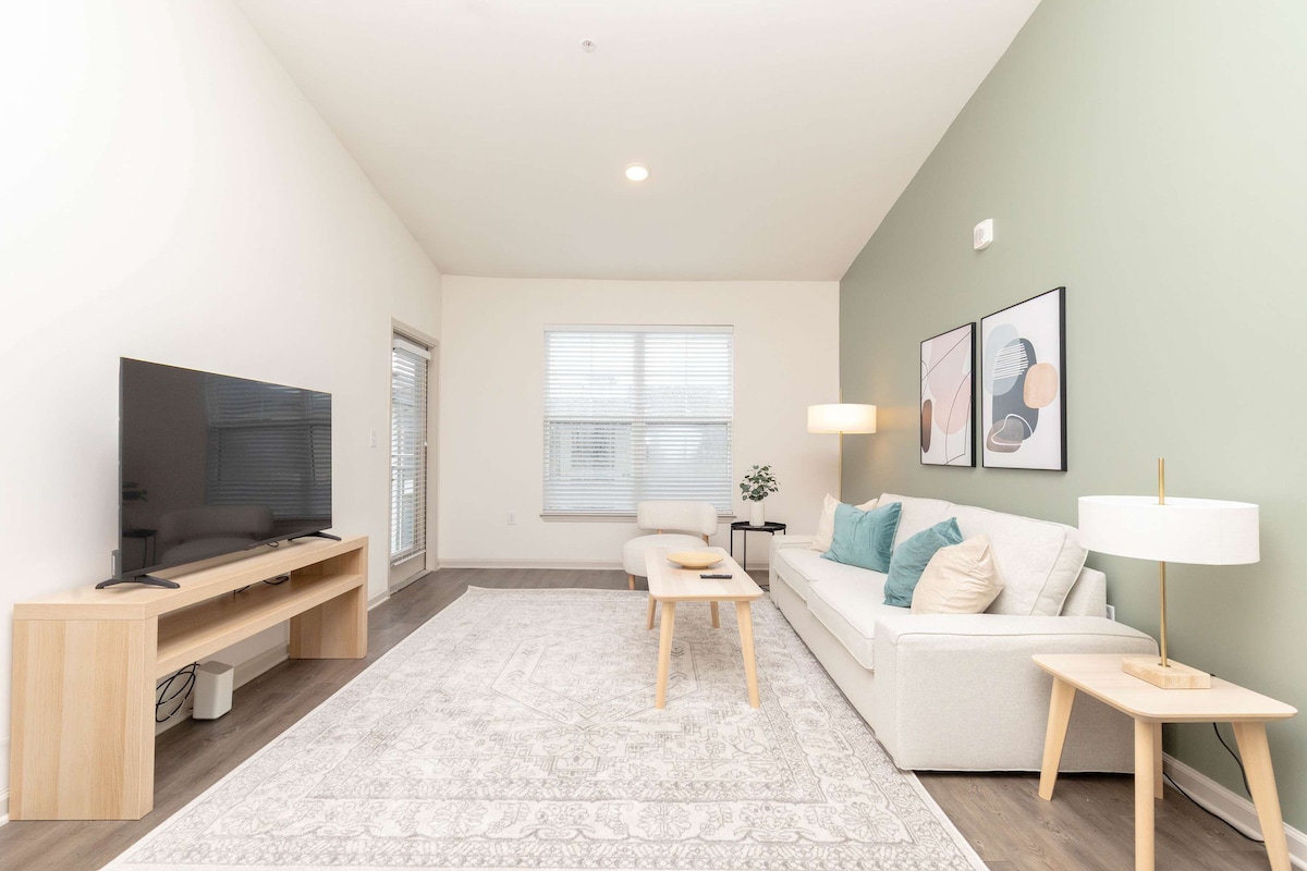 The Nashville is a stylish and thoughtfully furnished 1 Bedroom located on the fourth floor of a modern Brentwood community. Elevator-accessible and designed for comfort, the unit includes a full kitchen, high-speed Wi-Fi, in-unit laundry, and all the essentials for a seamless extended stay. Guests also enjoy access to on-site amenities including a pool, fitness center, and paid parking. Suitable for up to two guests.