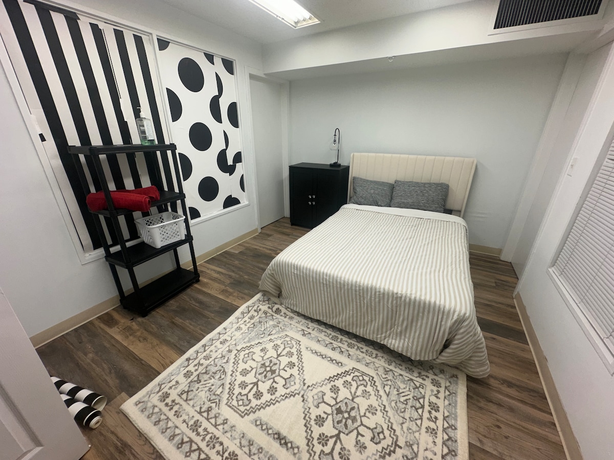 Desirable VIP room in a shared apartment, located on the lower level (basement) of the building. This private room features a king-size bed, nightstand, TV, micro fridge, and two bottled waters. It is completely separated from the other rooms in the house, offering privacy.
