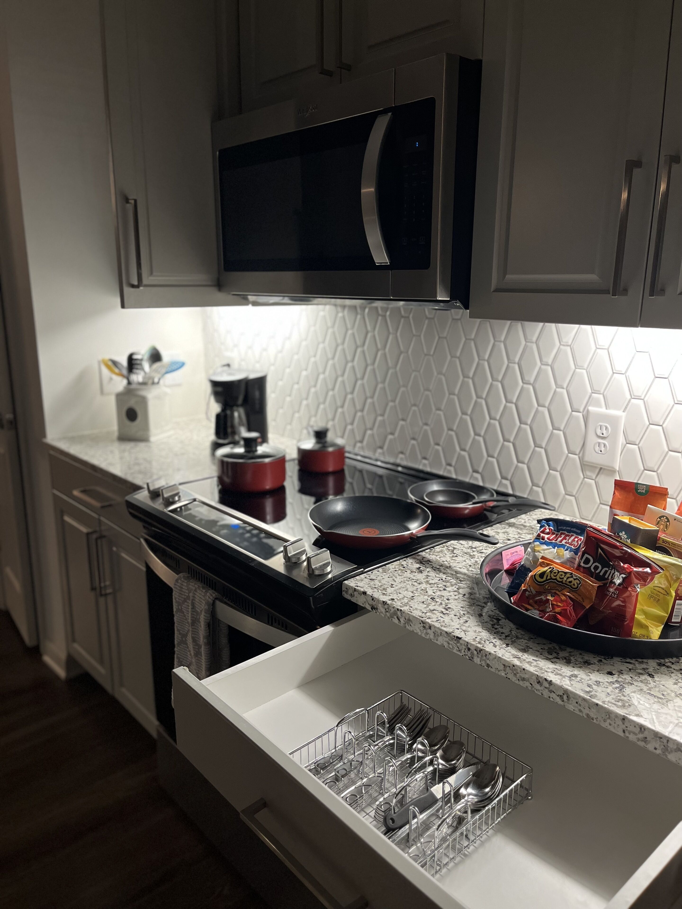 Step into comfort and style at Cadence Sugar Hill, your ideal stay for flexible, fully-furnished monthly or extended visits. Our spacious apartments feature full kitchens with stainless steel appliances, quartz countertops, and kitchen islands designed for cooking and entertaining. Enjoy nine-foot ceilings, wood-style flooring, and in-unit washer/dryers. Relax poolside at the resort-style pool, flow through yoga classes, or work from private office spaces.