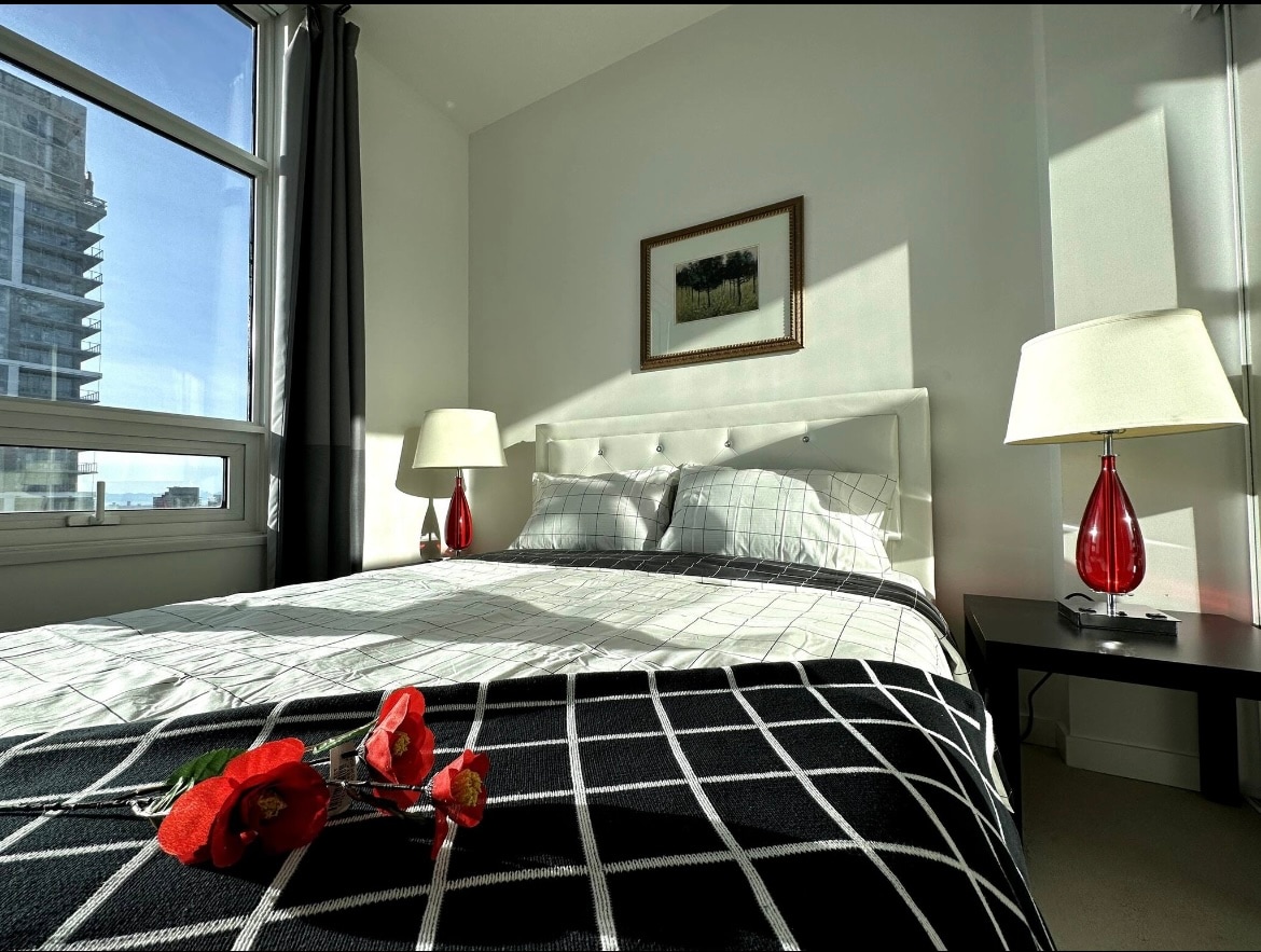A bright, spacious, super new unit, fully furnished and equipped. Located on a quiet street, 5mins away from both metrotwon and skytrain.