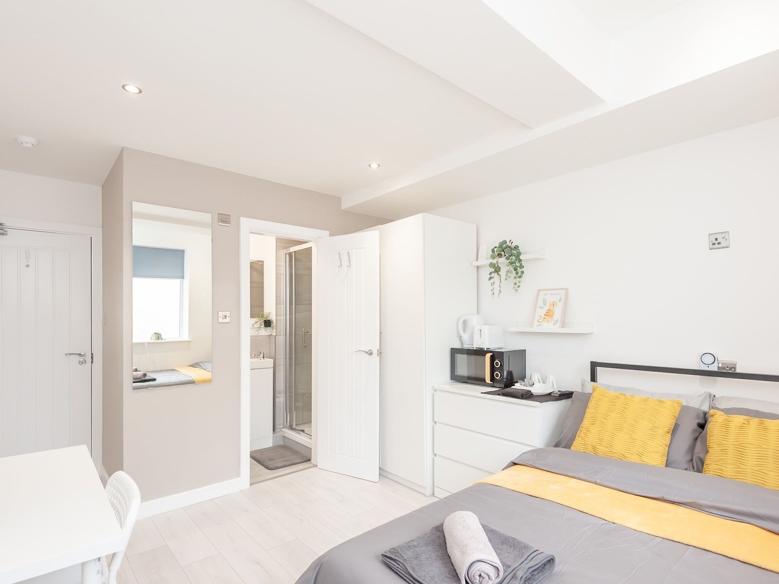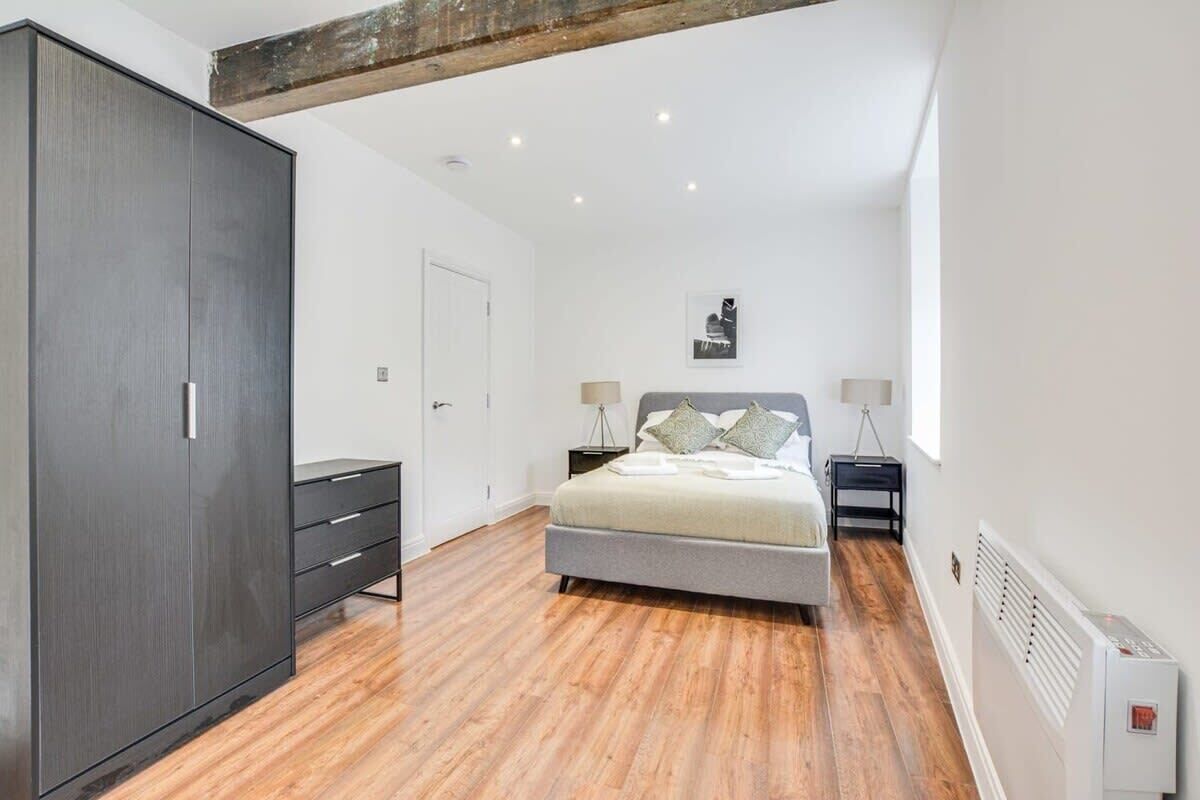 _Sleep Haven: Delve into tranquillity in the chic bedroom, with a cozy double bed, fresh sheets, and soft cushions. The wardrobe space means settling in is a breeze, ensuring a restful kip and a lively morning.
