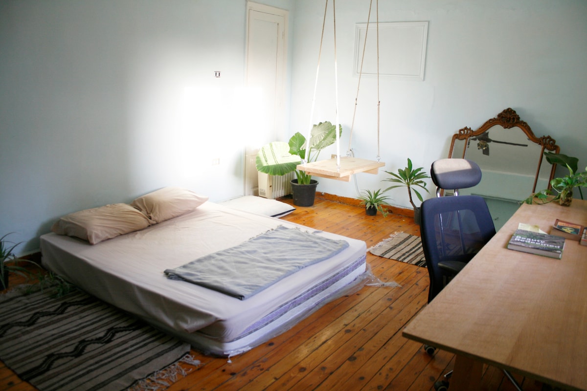 The sunset room is a clean, green, sunny, and peaceful room in Maadi. it has a king-size bed, studying/working desk, chair, swing, and clothes rack.