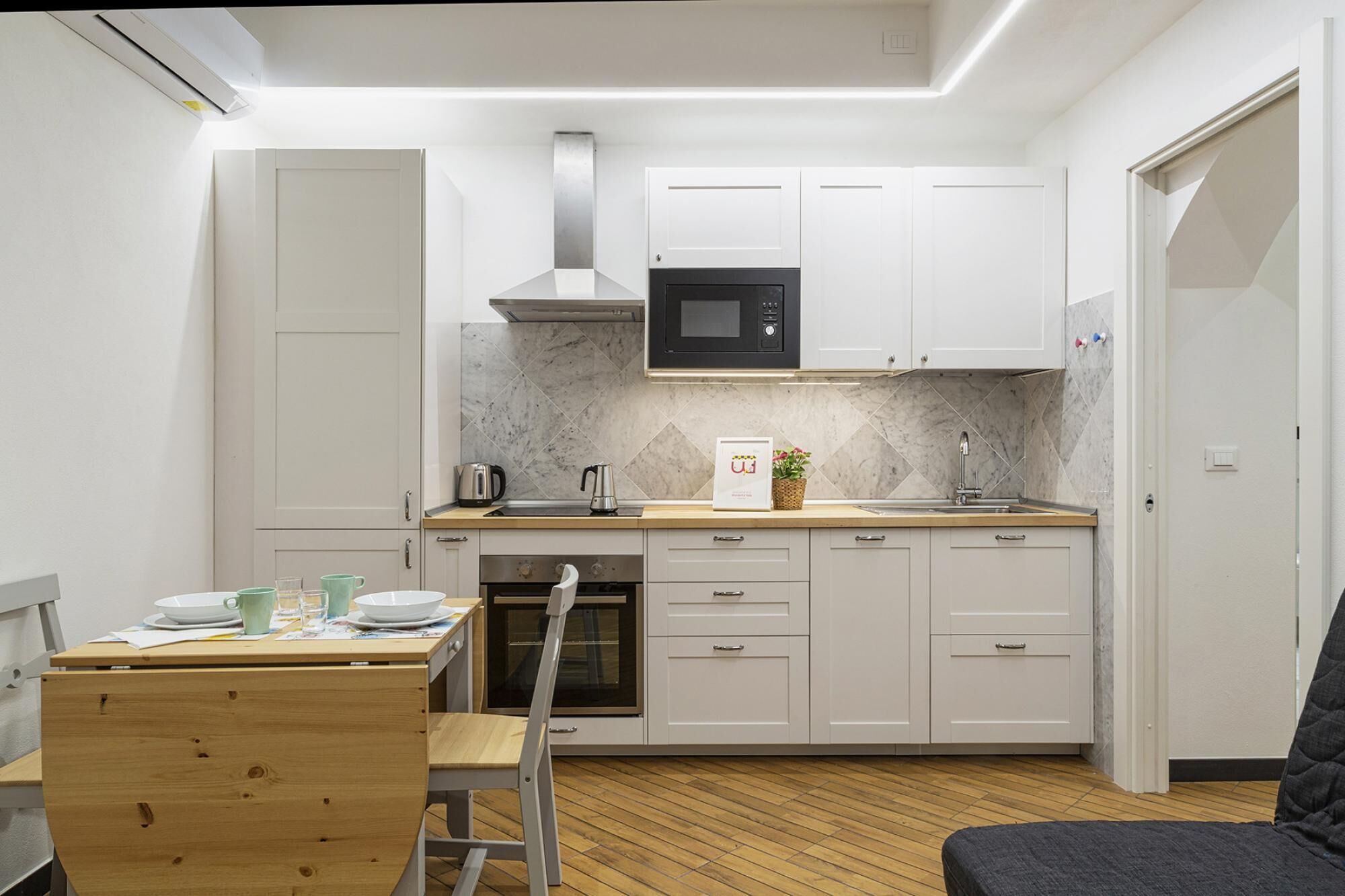 The kitchen, which can be used exclusively for preparing hot drinks or consuming cold dishes, is shared with the guests of the other rooms.