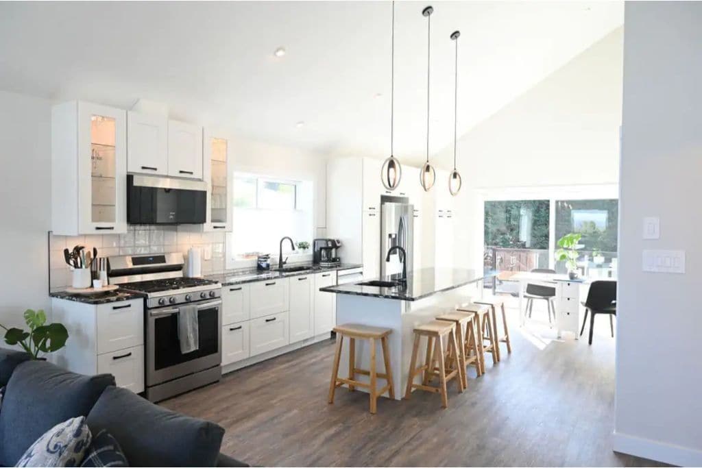 If you enjoy cooking then you will love the kitchen in the suite! The space features calming views of the ocean in the front, which exhibits sights of cruise ships or orca pods passing by, and a relaxing scenery of Simms Creek, a natural and protected spawning run for our local salmon, in the rear.