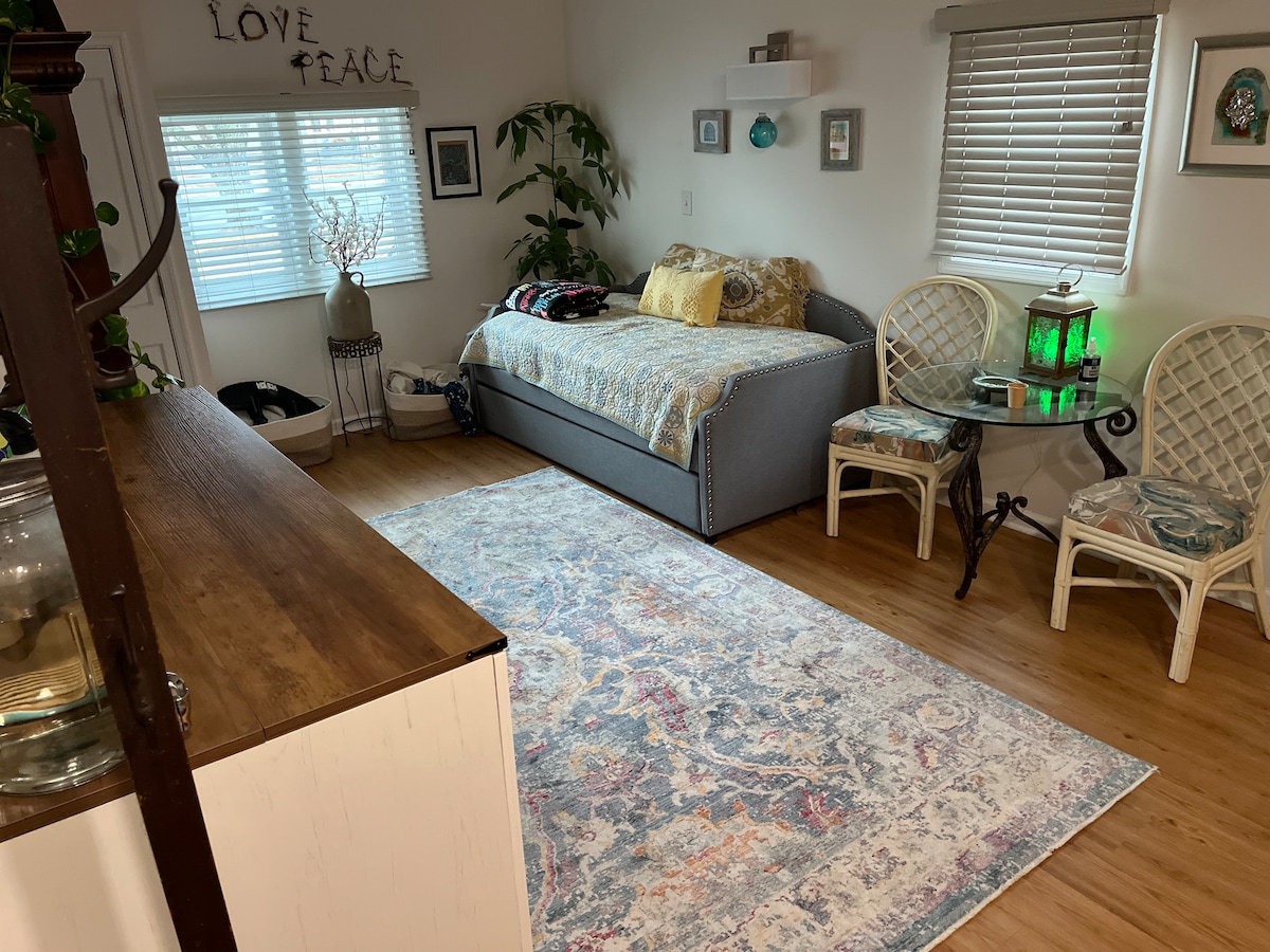 Enjoy and relax on the front porch with cushioned seating overlooking a tranquil neighborhood street and lovely landscaped garden. Enter into a cozy sitting room with a full-size sofa and a unique coffee table design; it lifts up to become a full sized dining table or workspace. 40” HD Smart TV, DVD player, and Alexa device for music and local info. The bedroom features a luxurious queen size Casper mattress with memory foam topper (5 star rated by most guests) made up with luxury 100% Egyptian cotton and viscose bamboo linens. There is a Roku TV for streaming your favorite apps, such as Netflix, Hulu, Apple TV, etc.