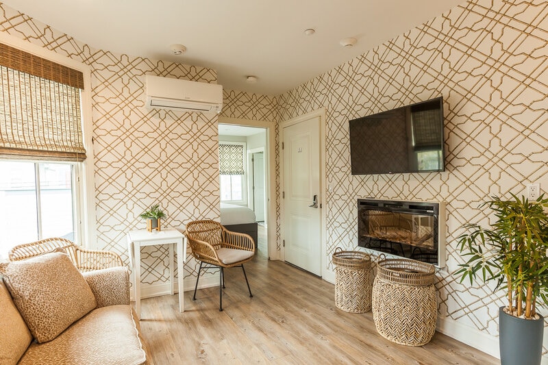 Our central location puts you right in the middle of the action, history, beach and dining. The Ocean Suite, located on the second floor. The unit features a private bath, walk-in shower, no tub, one bedroom and private parlor area. There is a kitchenette which contains a small refrigerator, microwave, two burner cook-top, coffee maker, dishware and utensils.The suite contains a 32 inch tv in sitting room; A/C