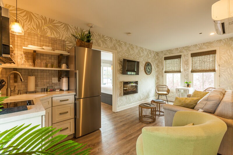 The Cottage has 2 outdoor porches with rocking chairs, and there is also a small courtyard shared with another cottage next door. The kitchen is completely equipped and we provide bath amenities and refresh all linens daily.