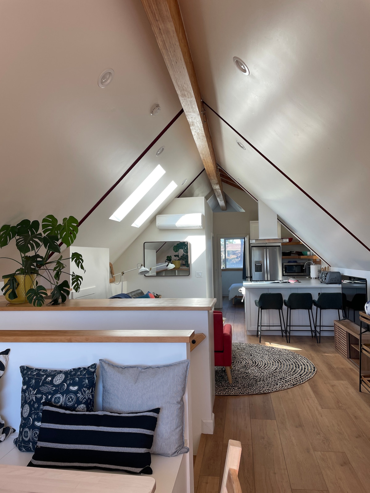 Just a block from the beach, this private guest apartment, perched above the detached garage, offers a peaceful haven with easy access to sandy shores. While it's compact at 410 sq. ft the space is efficiently designed for up to 4 guests, making it perfect for small groups or families.