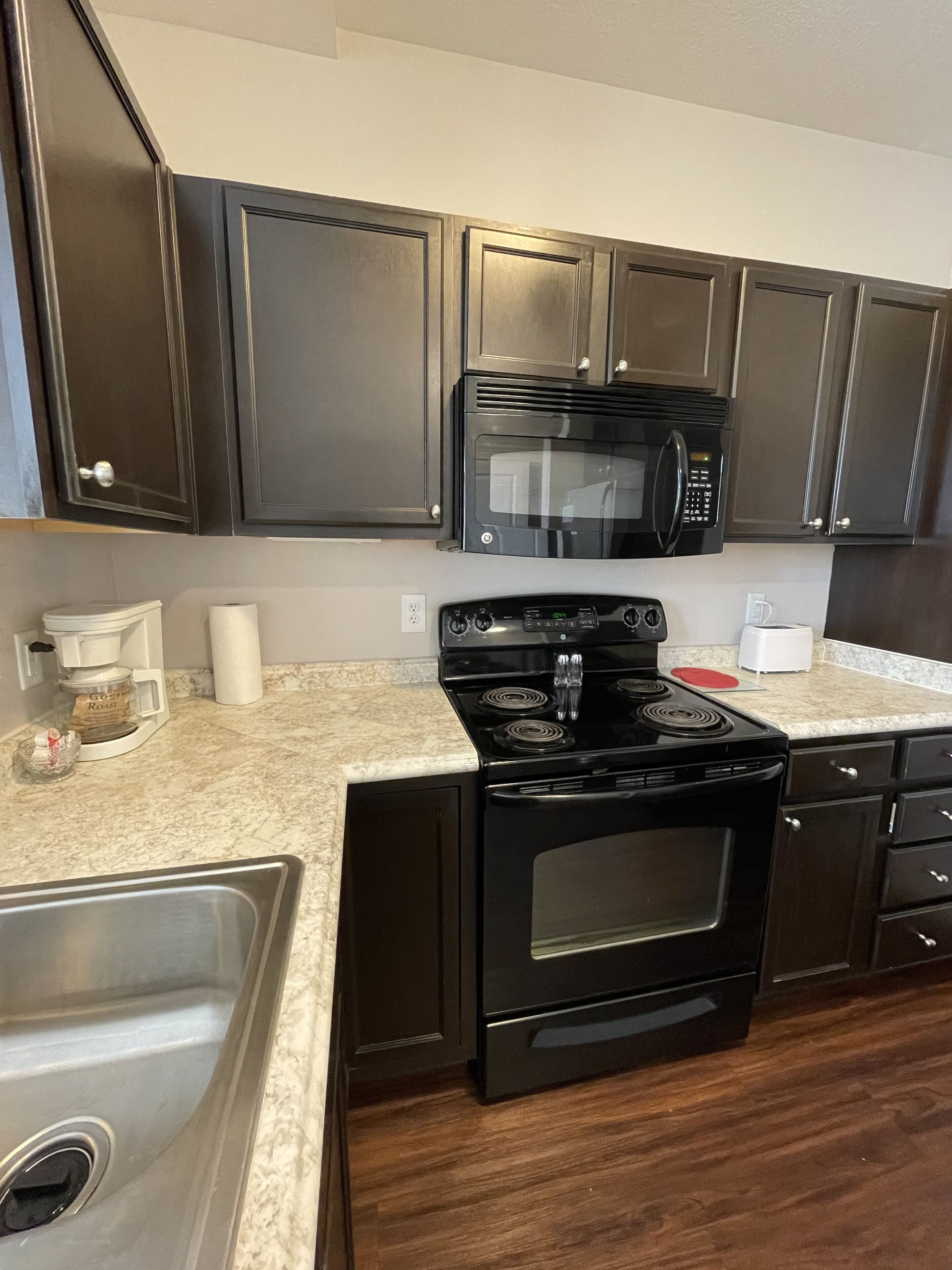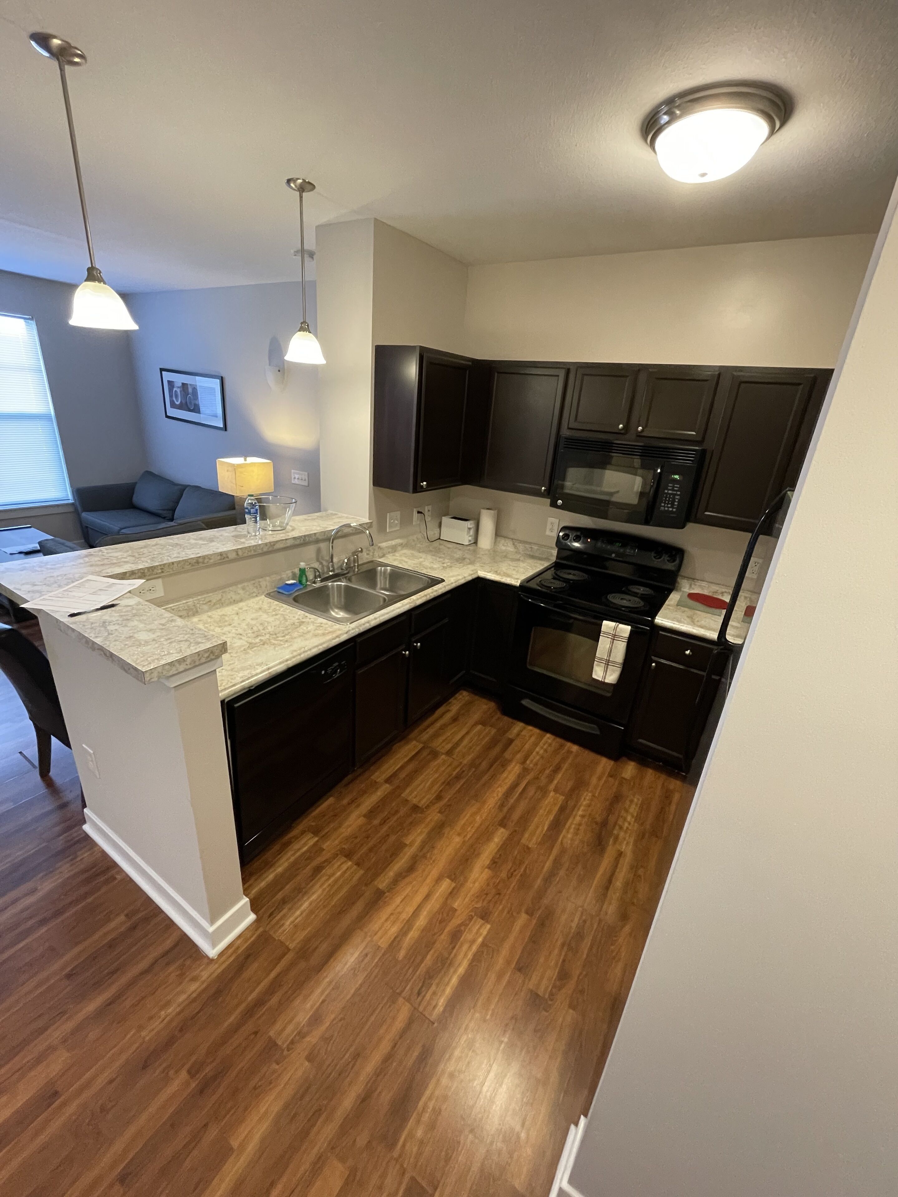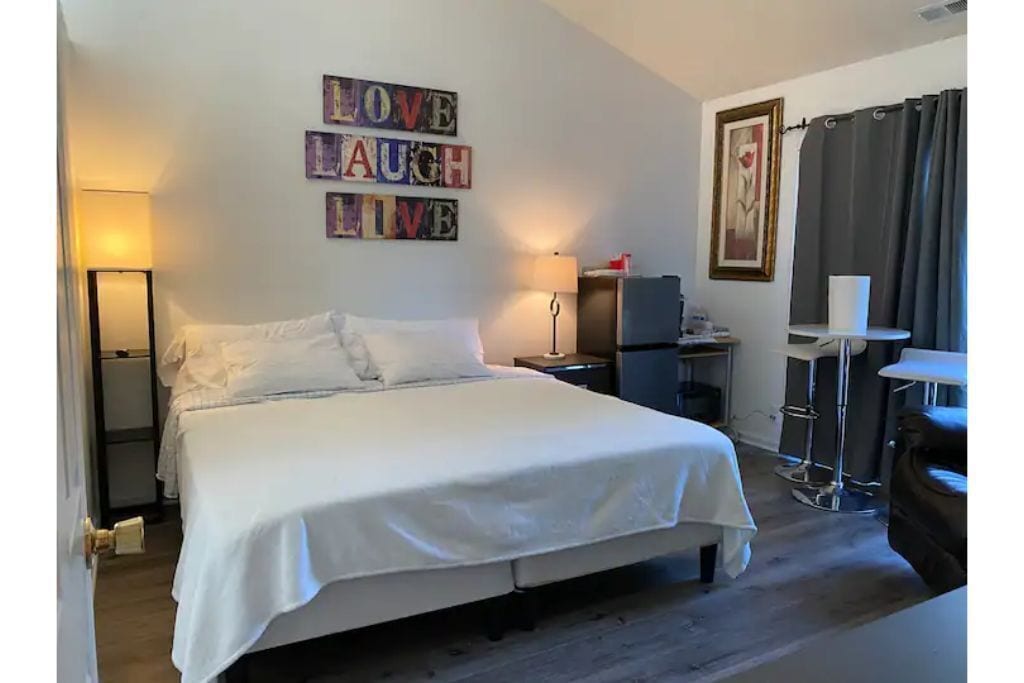 Way more space than a hotel. Fully equipped kitchen with cookware, appliance package, coffee maker, dining table with chairs, 55 inch TV in living room along with a 40 inch TV in bedroom with WIFI + Roku! Washer/dryer set with laundry basket and much more than that 320 square foot hotel ROOM! We are a great hotel ALTERNATIVE!