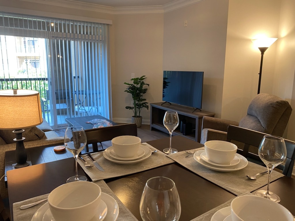 Guests will have access to the entire apartment, a resident-only outdoor swimming pool, a modern fitness studio, a lounge with a pool table & coffee bar, and a BBQ grill & picnic area. The kitchen is fully stocked with dinnerware, utensils, appliances, food storage, and pots & pans, so you can enjoy dining in just like you do at home. The Lounge has light complimentary refreshments as well.