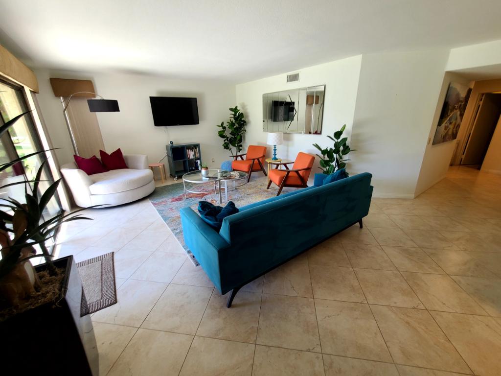 You will quickly fall in love with this vibrant and upgraded, modern condo in Cathedral City, right between El Paseo and downtown Palm Springs. This spacious, second-floor getaway is furnished with mid-century modern decor and adorned with bold, original artwork. Prepare anything from your morning coffee to full-course dinners in the well-equipped kitchen complete with select stainless steel appliances and a breakfast bar. Dine together at the table for six, and then settle into the inviting and colorful living area complete with a large, smart flatscreen TV, or step outside onto the furnished balcony overlooking one of this complex' five heated pools. Guests can play on the tennis courts, work up a sweat in the fitness room, or just take a stroll around the landscaped grounds.