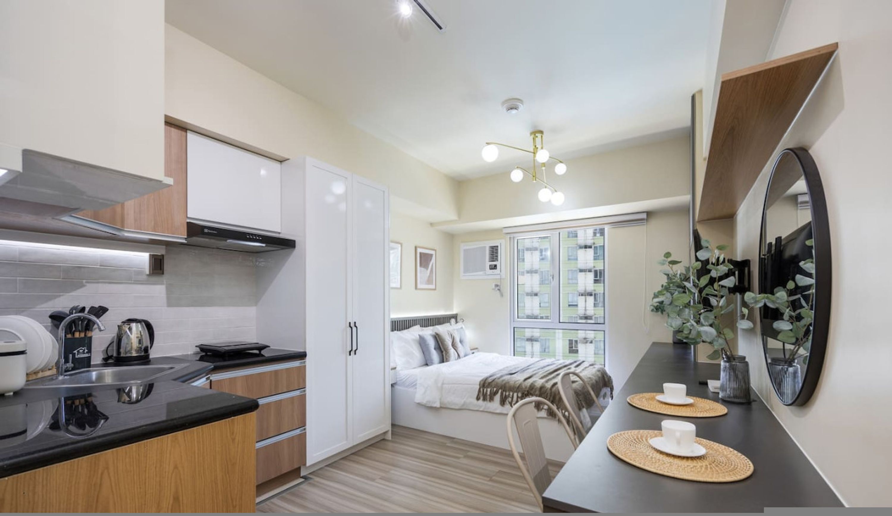 A cozy 1 bed space. With a functional kitchen and WFH space. Outdoor pool and gym is also available for a fee (200 PHP). 24/7 Convenience store, massage parlor and laundry services within area.