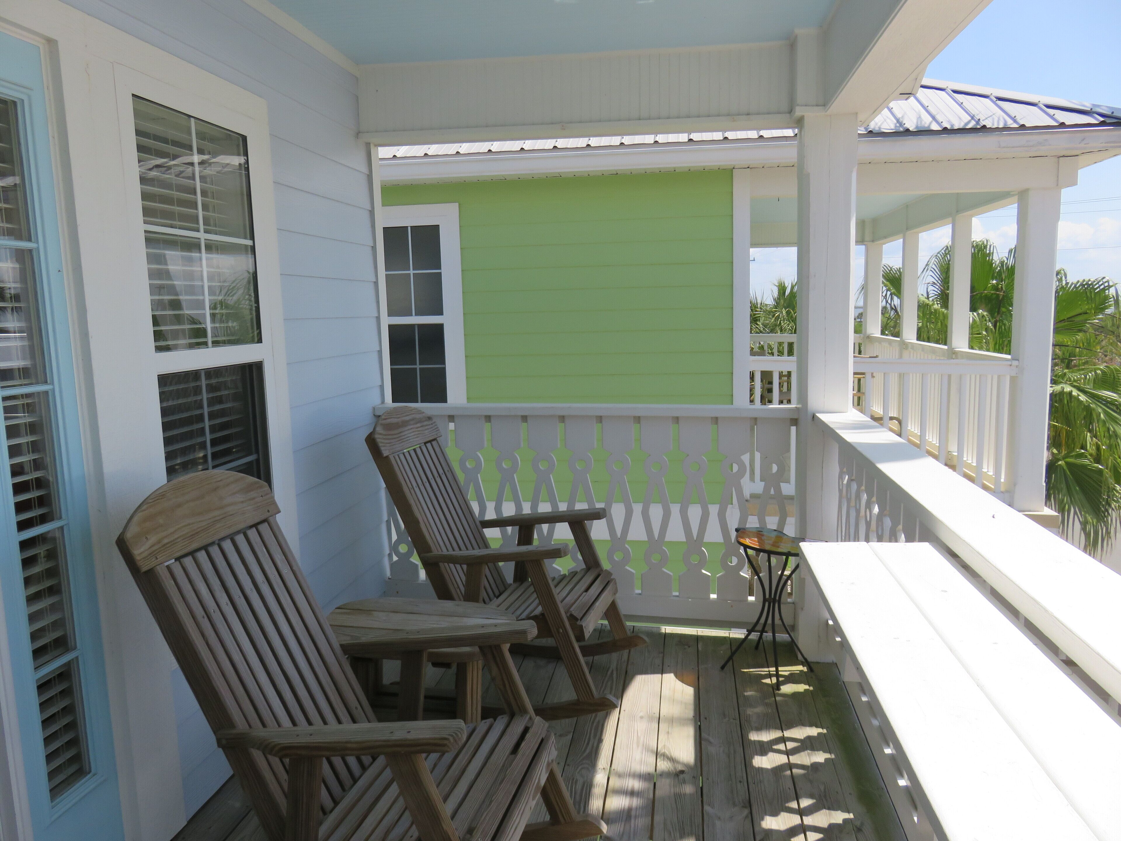Marigold is the top floor unit and has a comfortable Queen size bed with memory foam topper in the spacious vaulted ceiling bedroom. The bathroom has a tub and shower combo. The living room is spacious with vaulted ceiling and private balcony. There is comfortable seating here and it is large enough to invite a couple guests over for a visit. There is WiFi and Direct TV. The kitchen is compact with a refrigerator/freezer, a two-burner stove, both a Keurig and drip coffee maker, Cuisinart toaster oven, small sink and a bistro table with two stools. The balcony also has a bistro table and comfortable seating for two. We have a max occupancy of two and do not allow smoking or pets at the Marigold House. From your top floor balcony, you have a panoramic view of the key and the water beyond.