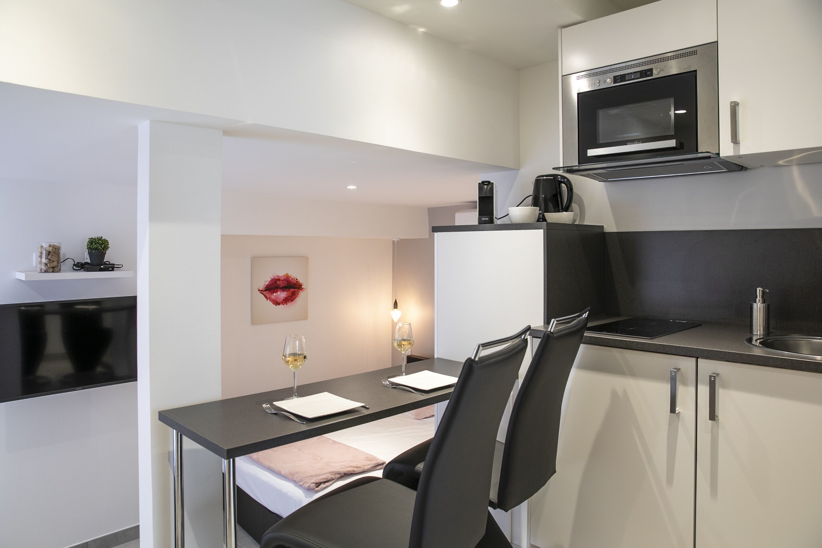 - Kitchen equipment (induction hobs, oven, microwave, fridge with freezer, coffee machine with capsules, kettle, toaster, utensils, cooking equipment, dishes, wine glasses...)