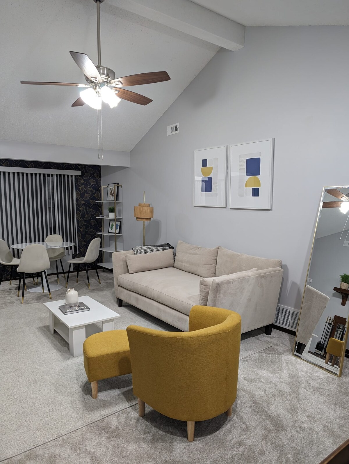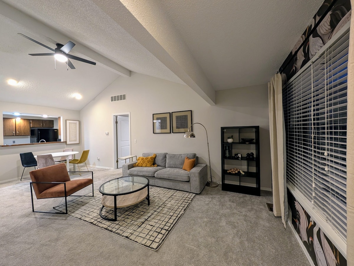 Newly renovated and thoughtfully designed with a colorful modern vibe. Very convenient location right next to Starbucks, Walgreens, Jimmy Johns and only a 6 minute drive to U of I campus. Equipped with a full kitchen, 65" Smart TV with streaming apps, dedicated workspaces, high speed Wi-Fi, adjustable height standing desk, Keurig coffee maker! A perfect place to work remotely or stay for your visit in Champaign!