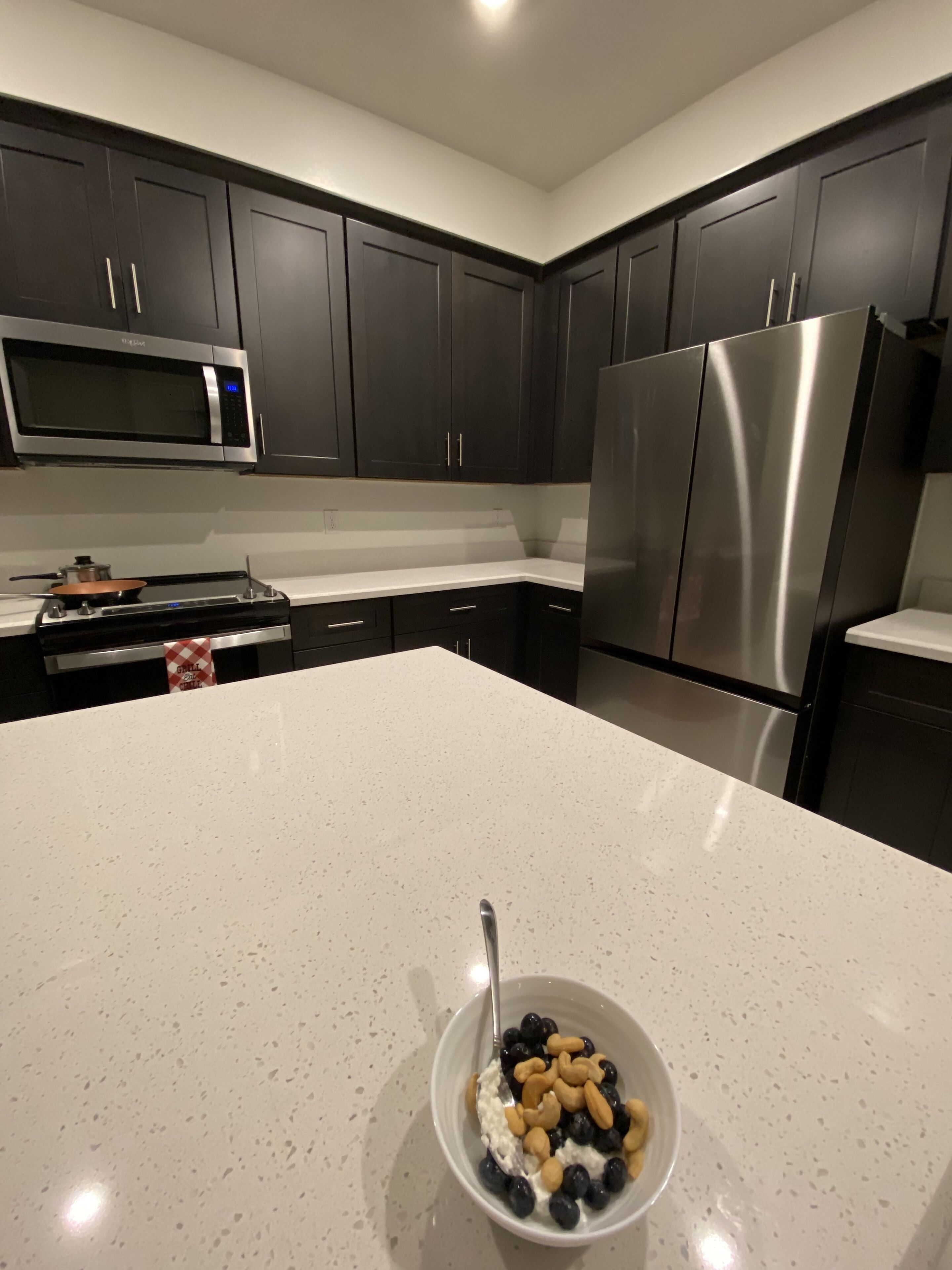 - Quartz countertops, stainless steel appliances, a fully equipped kitchen,