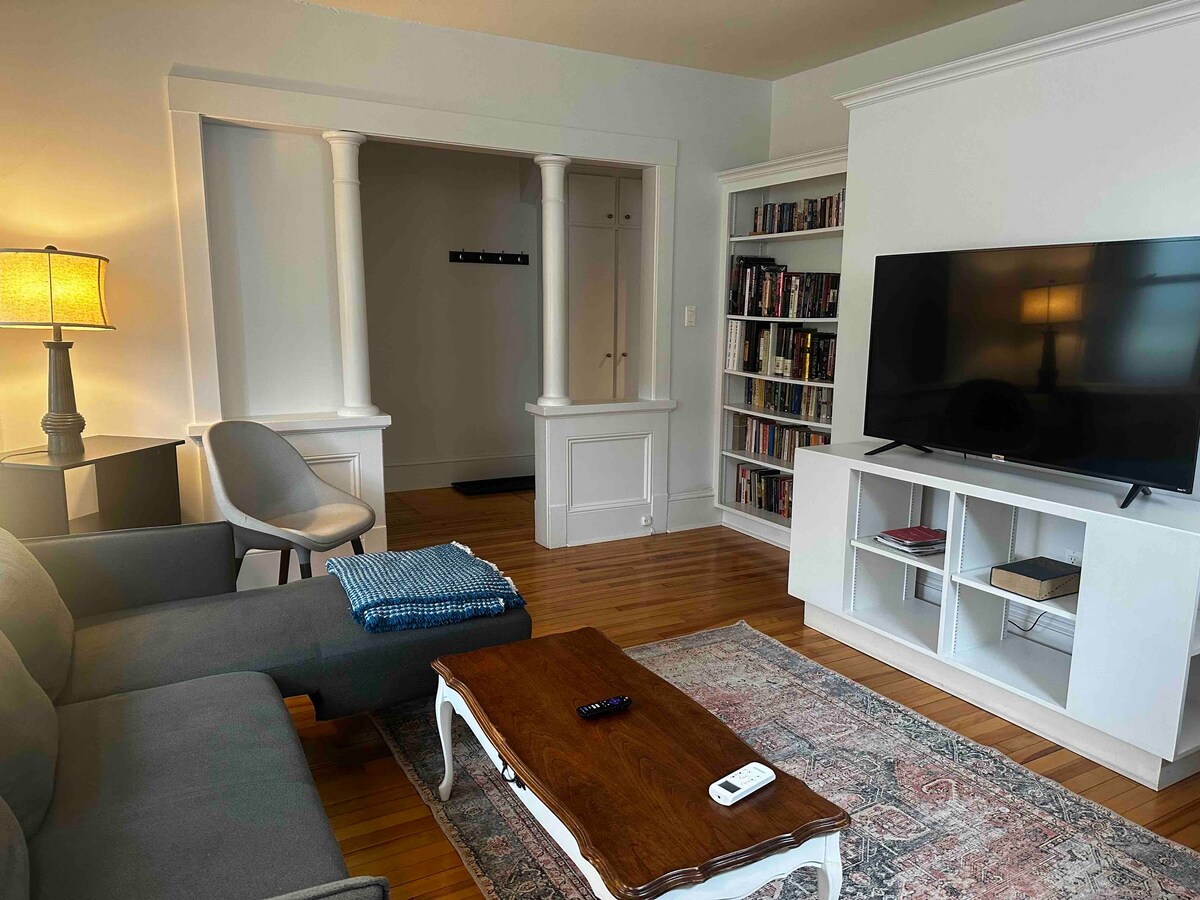 The apartment is self-contained and located on the first floor of a detached house. The second floor hosts office space for local businesses. Guests will enter through the same foyer as the second floor, but once in your unit, it's all yours! The apartment opens into a bright, sunny living room with windows overlooking the park and a 55" flat-screen TV. The back half of the apartment has a large bathroom with stand-up shower, a large bedroom with a queen bed, and an eat-in kitchen. The kitchen features a stand-alone four-burner electric cooktop, a full-size refrigerator, a microwave, double sink, and a coffee maker.