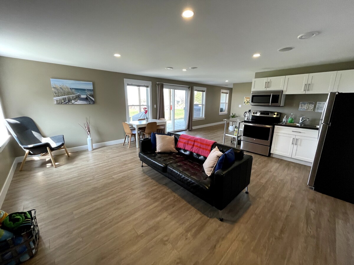 Welcome to King Loft Suite 3, a beautifully designed 1-bedroom deluxe loft apartment that blends modern comforts with the charm of historic Charlottetown. Relax in a spacious living area with a cozy sectional sofa and large-screen TV, or prepare meals in a fully stocked kitchen. Your private balcony offers breathtaking water views—perfect for unwinding with a book or morning coffee.