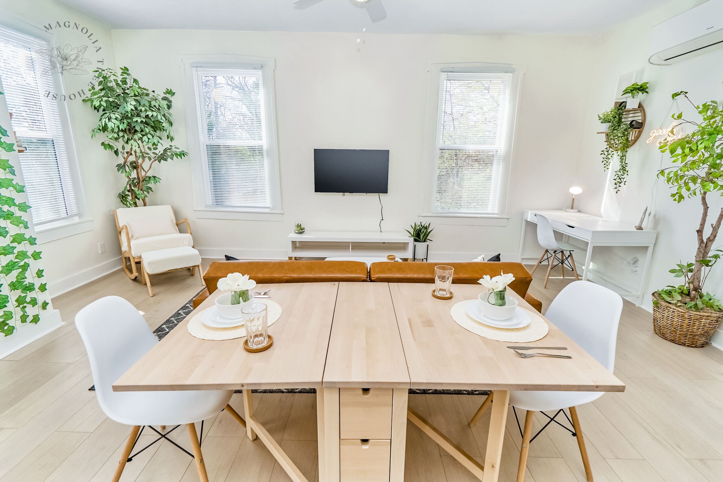The tall windows make the space bright and airy and give you a 180-degree scenic view of the treetops. To bring the outside in, we decorated the apt to feel like the trees are also inside. The cozy furnishings will make it hard to leave.