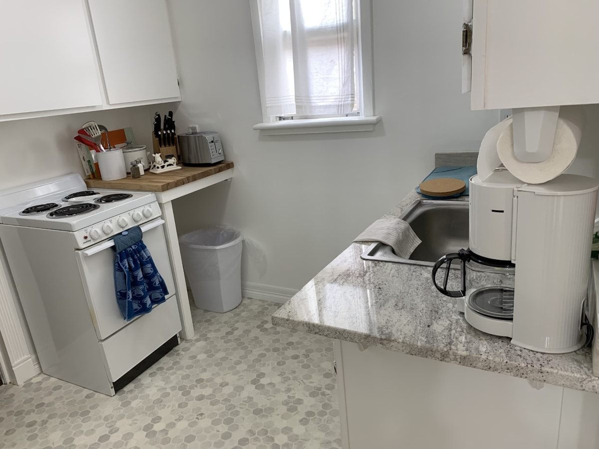 You’ll have full and private access to the entire one-bedroom apartment. In addition, you’ll have one off-street parking space. Finally, there is a shared laundry room with coin-operated laundry for your convenience.