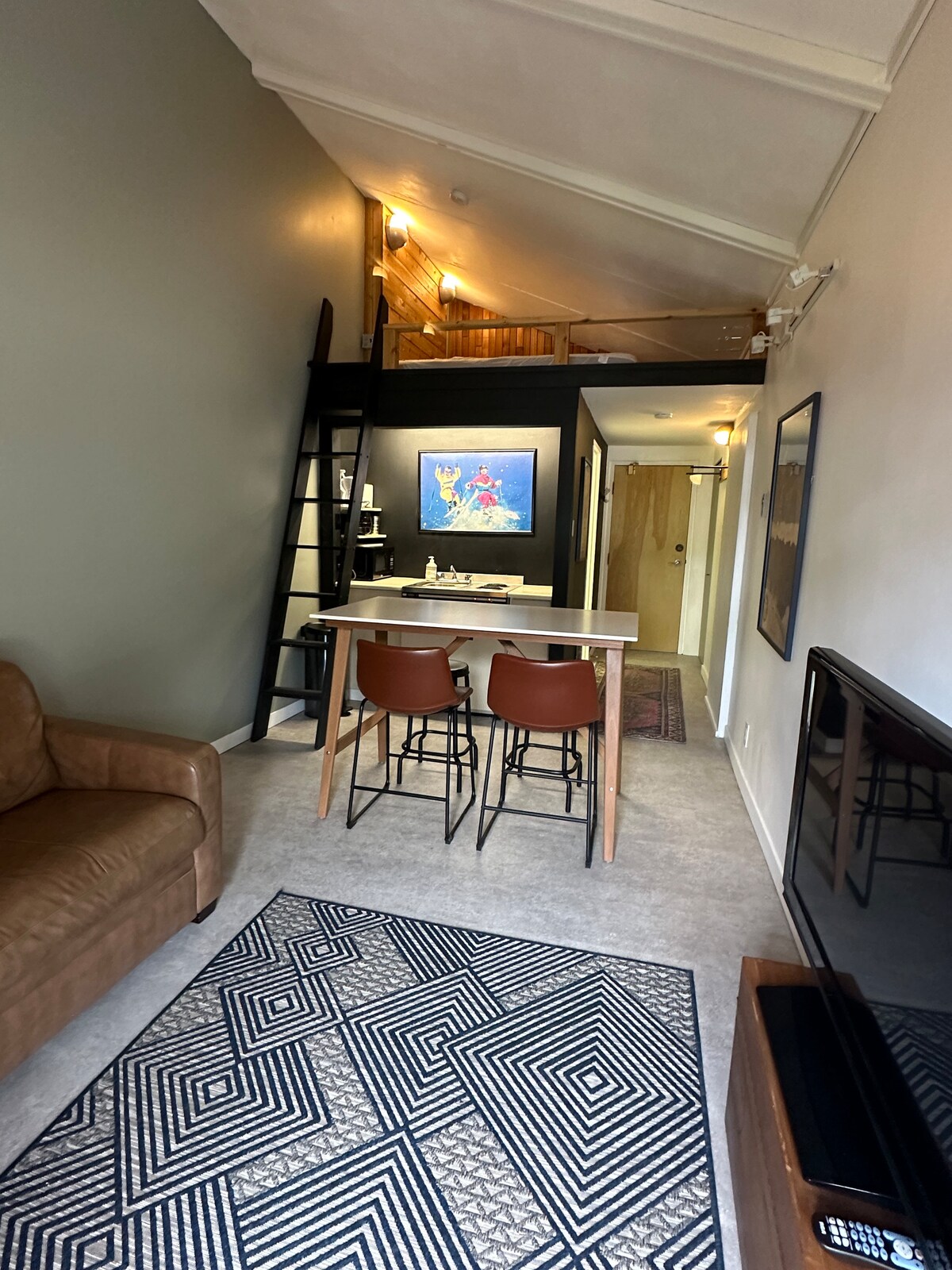 Studio with loft, kitchenette, and full bathroom. 5th floor. No elevator.