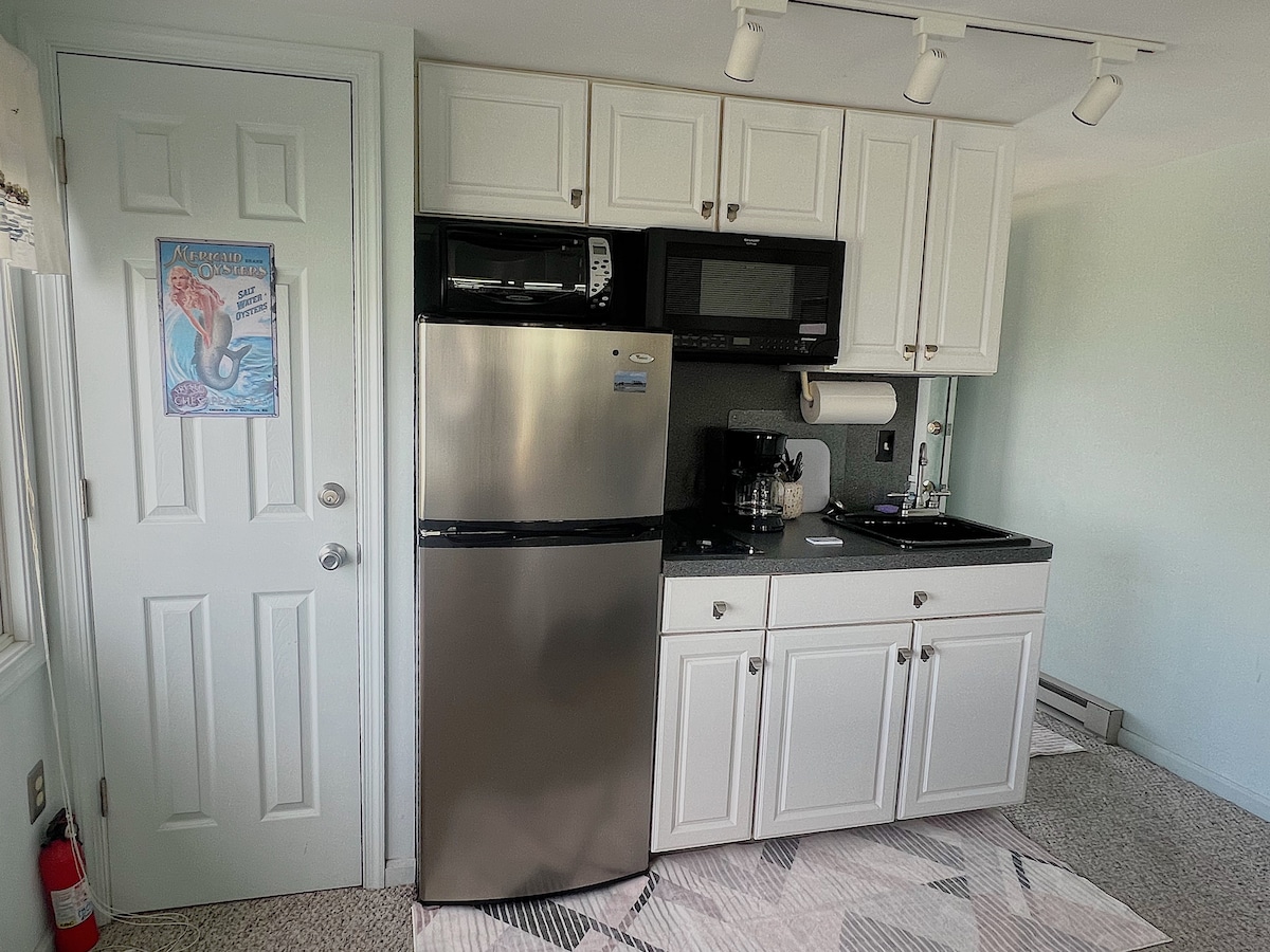 Kitchenette with 2 burner stove top, microwave, and full size fridge.