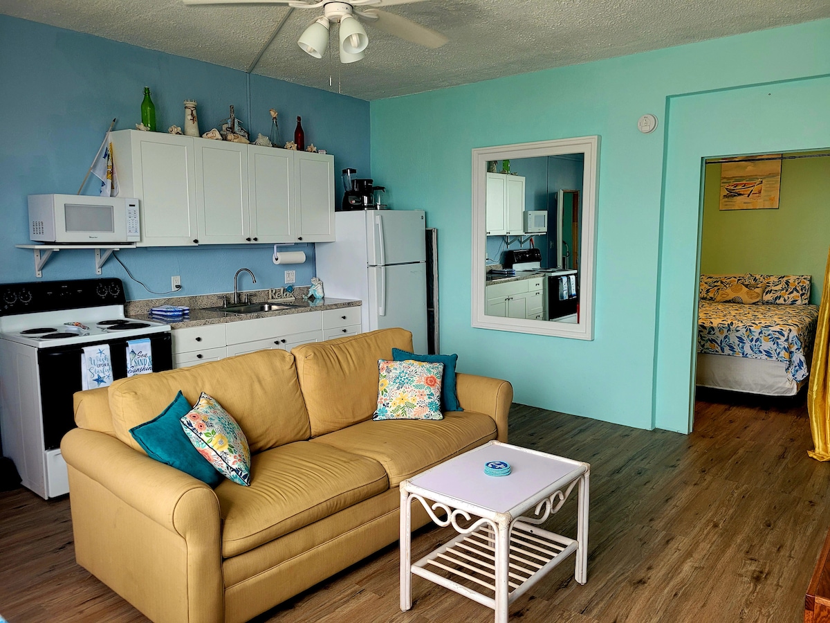 The condo has been updated and includes airconditioning, ceiling fans in the bedroom and living room, a full kitchen including toaster oven, microwave, and blender. You will find beach accessories including beach chairs, floats, coolers, beach towels and snorkeling equipment.