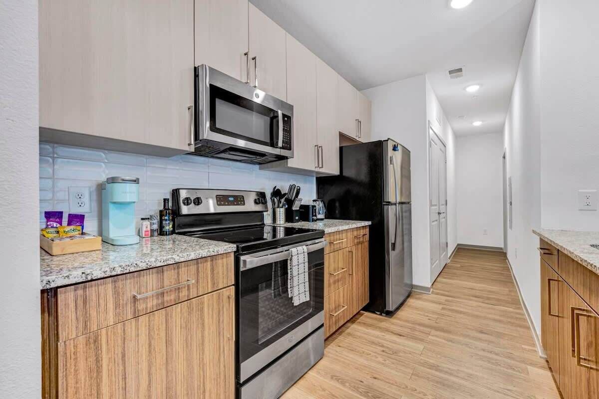 Step into style and comfort with thoughtfully designed spaces featuring luxurious wood-style flooring, stainless-steel appliances, and stunning tile backsplashes complemented by sleek granite countertops. Each home boasts high-powered Wi-Fi, a deluxe 65” flat-screen TV, and contemporary furnishings. Soaring nine-foot ceilings, designer lighting, and ceiling fans create an airy and inviting atmosphere.
