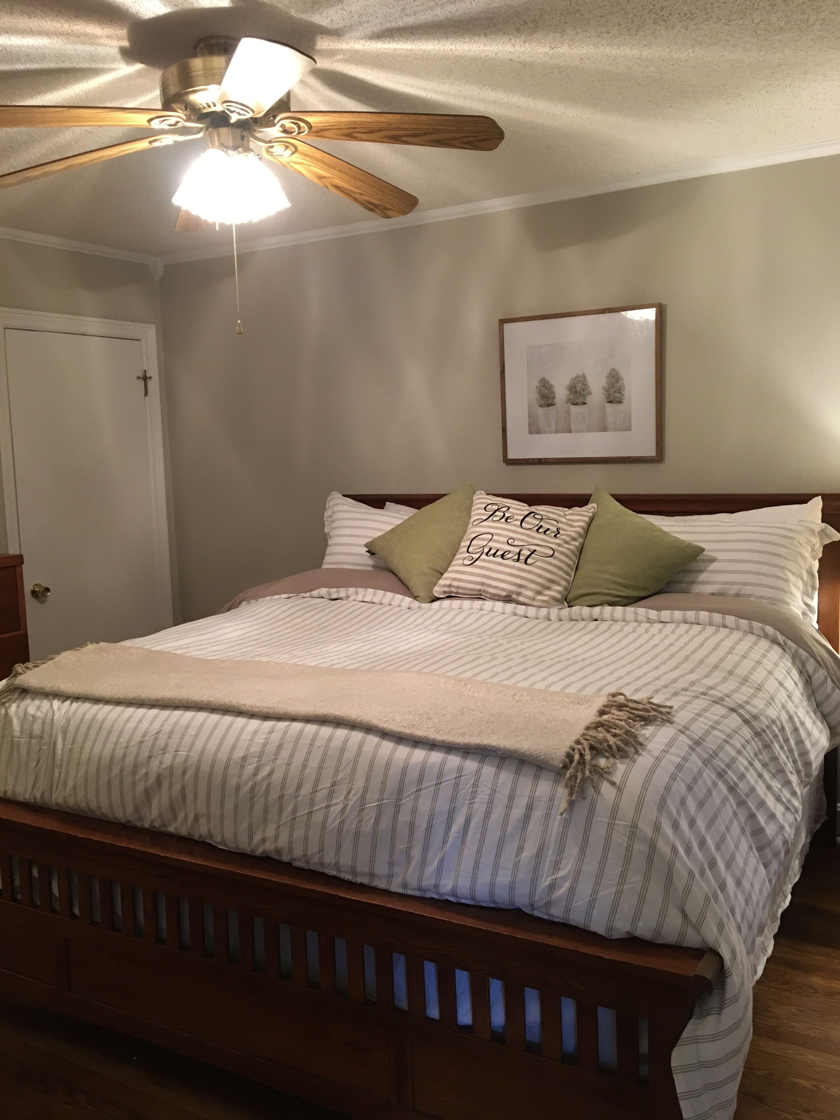 A very happy vibe, it’s a home away from home comfortability. We love having guests, & we’d love to host you as well! You’ll love our comfy beds topped w/the fluffiest down comforters!