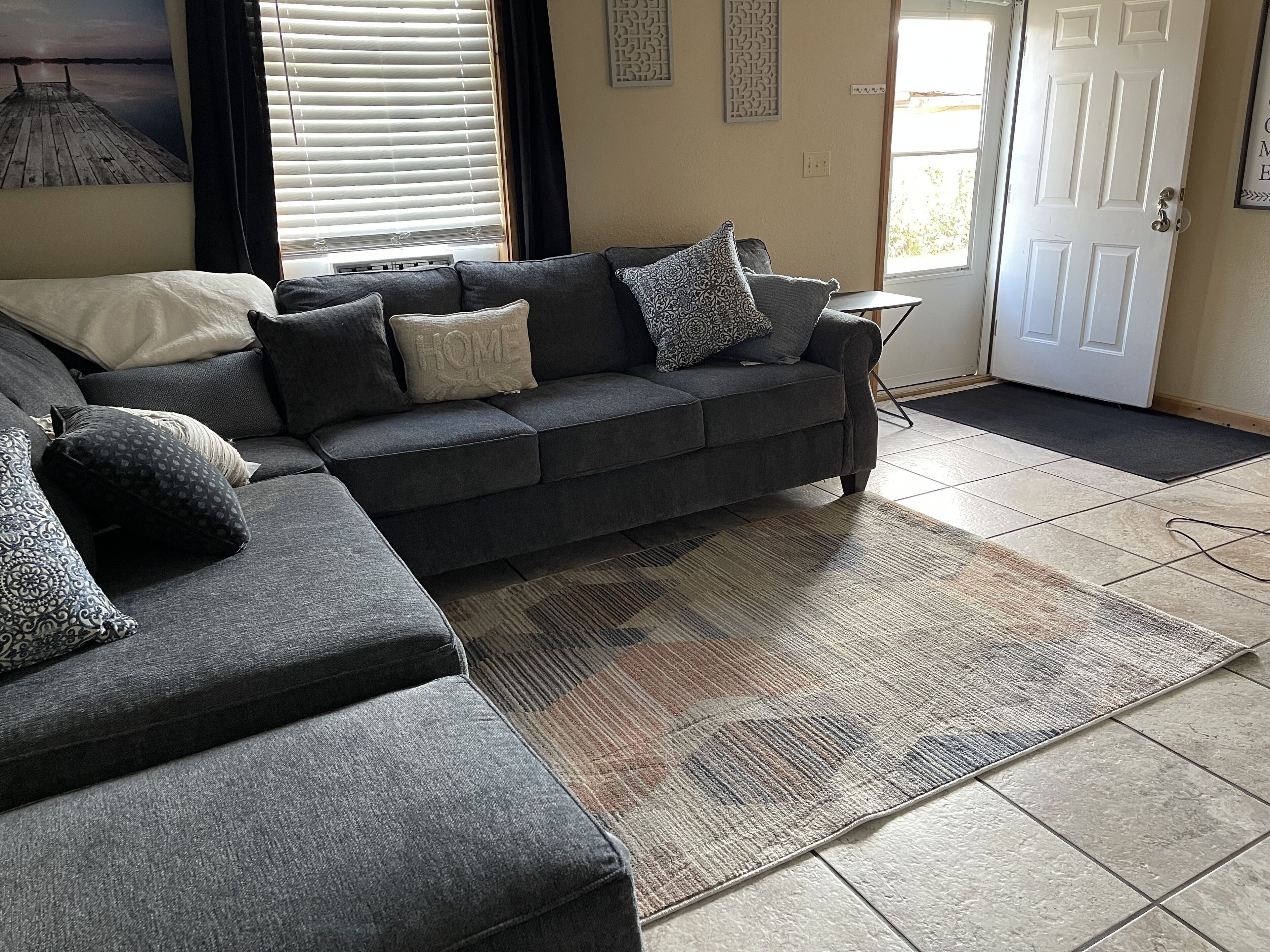 Open Living Space: The living room features a spacious sectional sofa and flows seamlessly into the open-concept kitchen, creating a bright and inviting area to relax or gather.