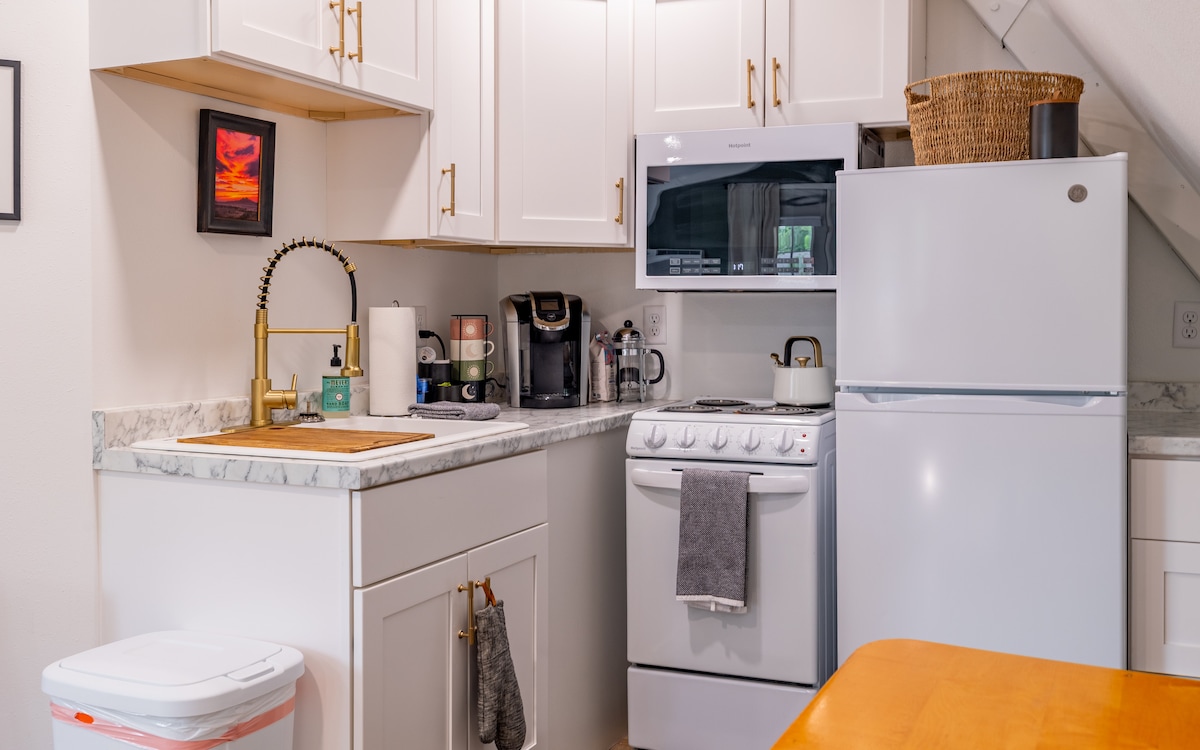 KITCHEN: Cooking basics, microwave, refrigerator, stove/oven, dishware/flatware, Keurig coffee maker, toaster