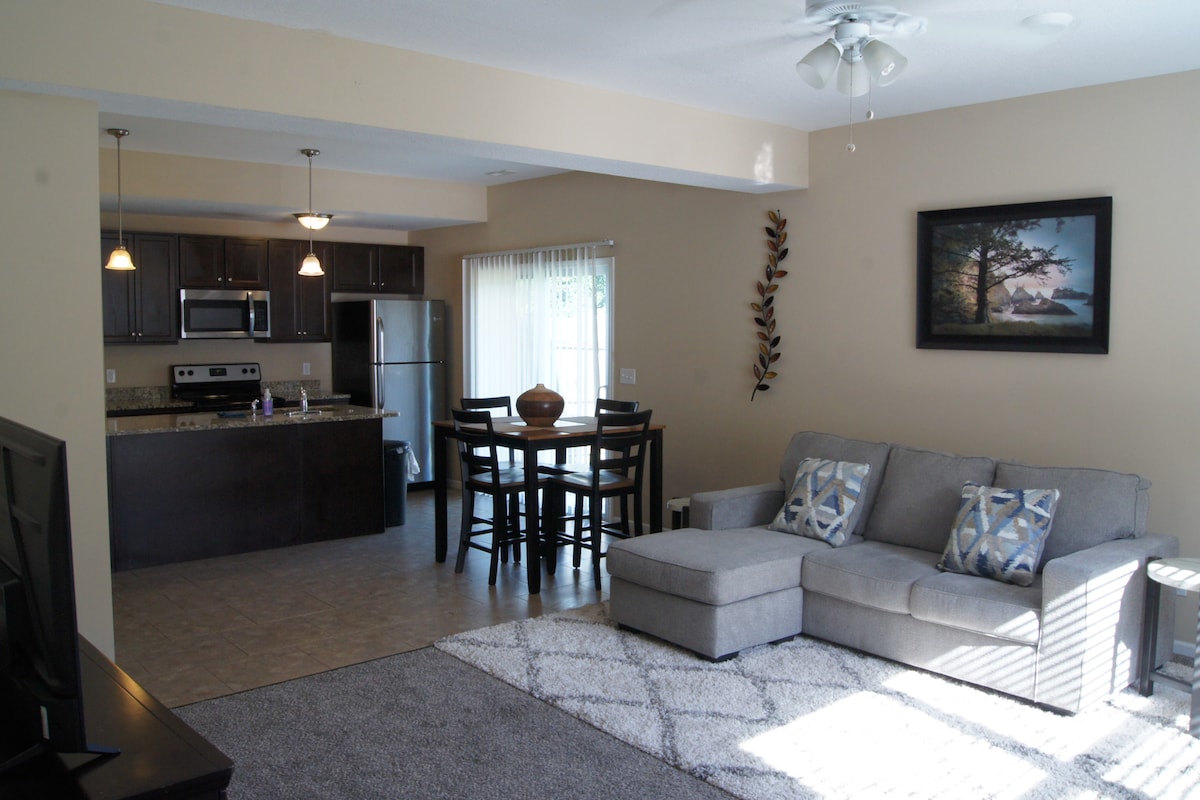 Pool is open until Sept 29 . Cool ground floor level apartment within walking distance of Faurot Field and Mizzou arena located in the heart of the southside of Columbia. Steps away from Lakota, Murrys, Flyover and Taphouse to grab a local favorite meal. 5 min drive to most hospitals and the University of Missouri. The 2 bed 1 bath apartment includes all new furniture, in unit w/d, Wi-Fi, Roku smart tv and necessities . Main bedroom has a California king size bed.
