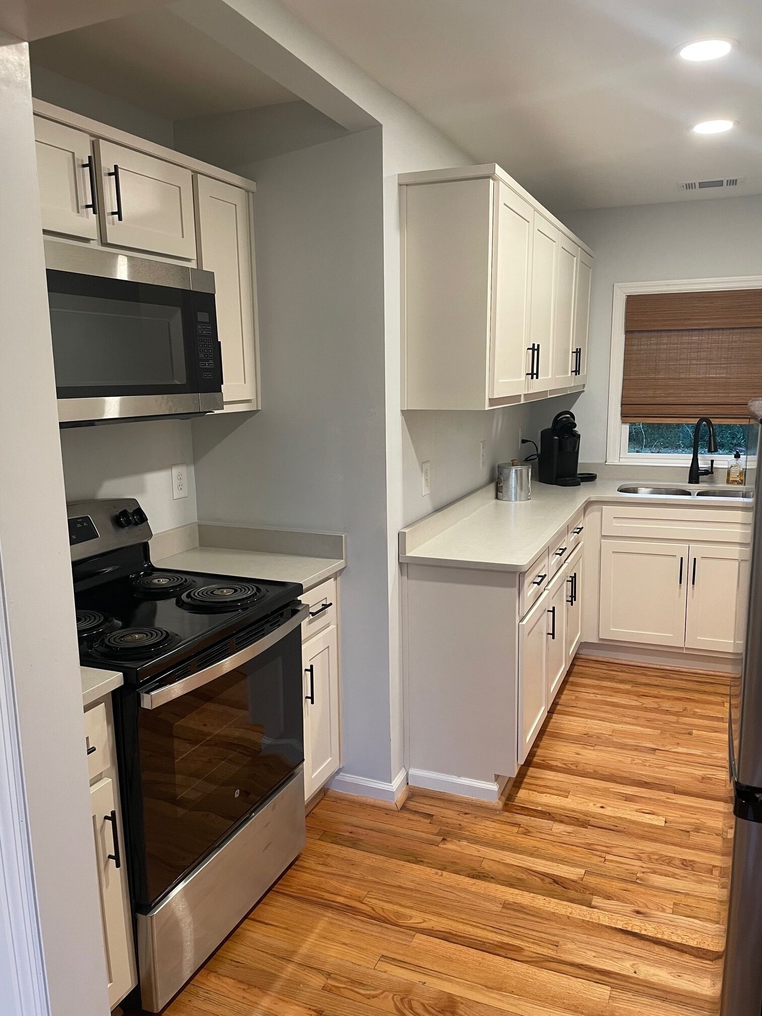 Our recently renovated, first-floor apartment features two cozy bedrooms with queen beds and one bathroom. The unit includes a modern kitchen and an in-unit washer and dryer, ensuring all the comforts of home.