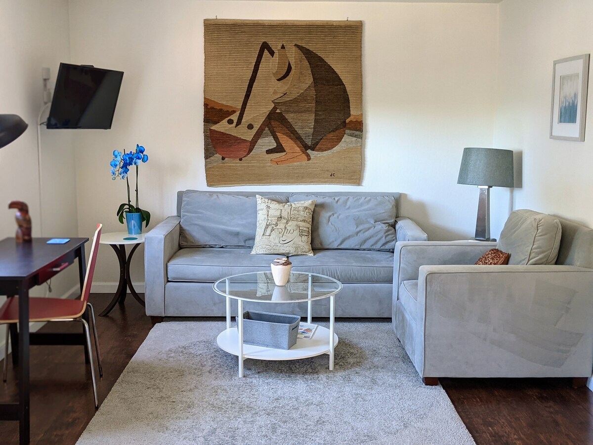 A beautiful, large & bright studio with its own kitchenette, eating area, desk, large walk-in closet, and a sitting area with TV. It's a short drive to the UC Campus, Berkeley, and Oakland, and only 45 minutes to SF via Bus/BART & 3 bus lines are less than 5 min away (7, 67, H). Just steps away, you'll find some of the best views of the Bay, our favorite wine shop in the East Bay, delicious cafes & restaurants, and a grocery shop.