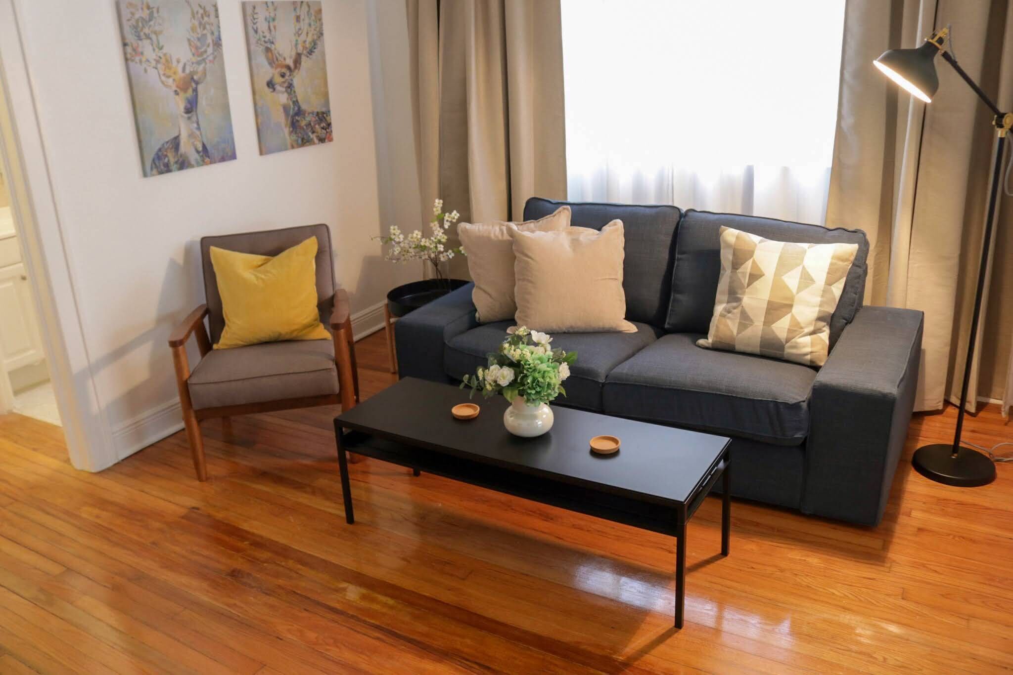 Beautiful and renovated 1 bedroom/1 bathroom apt with sofa bed, private patio, kitchen, and living room.