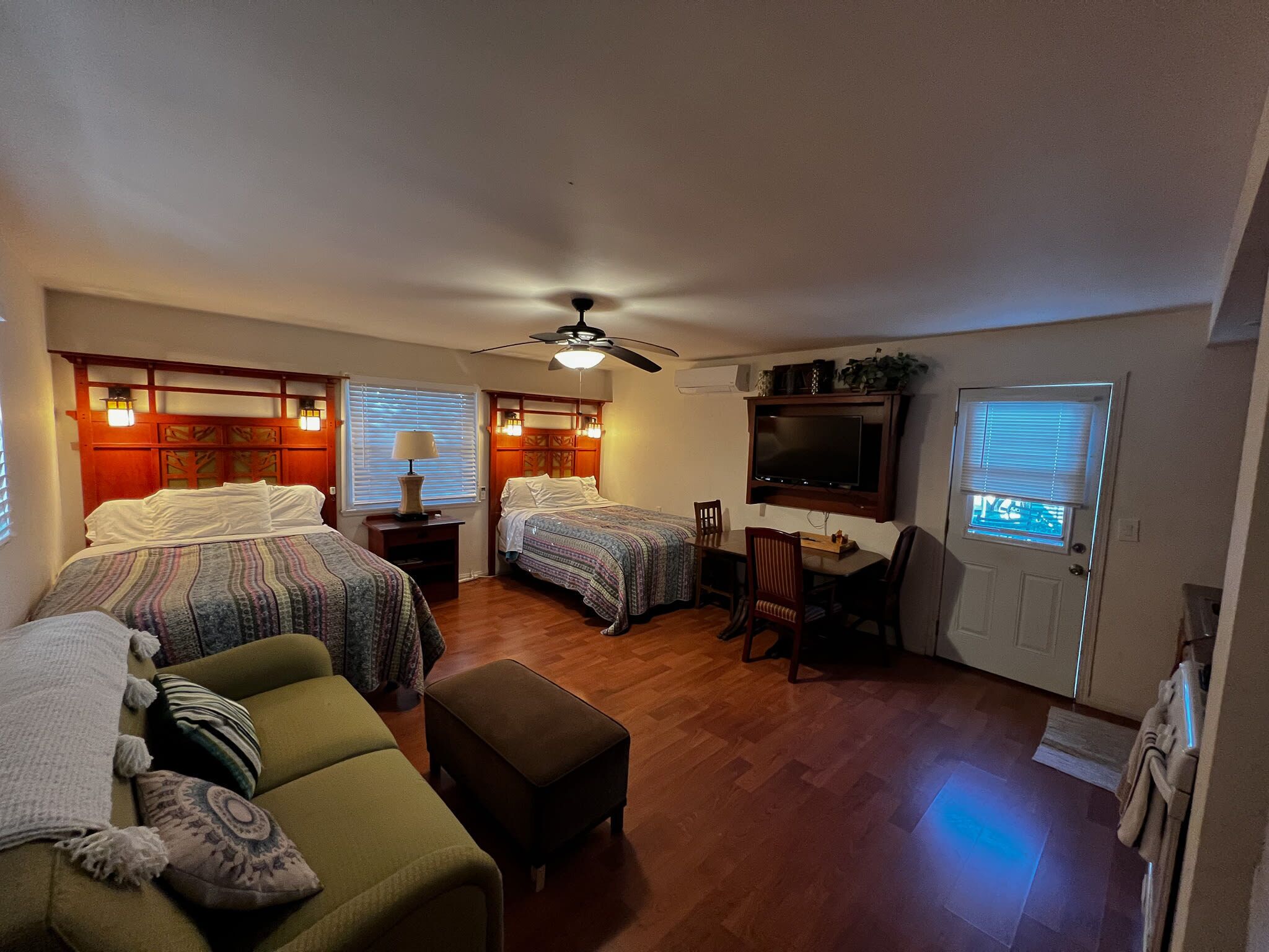 Suite C at Canyon Ranch, a cozy studio ideal for couples. This suite features a nice king-size bed, a beautiful decorative fireplace, and a large Smart TV for your entertainment. The upgraded kitchenette includes a large fridge and an all-in-one toaster, griddle, and coffee pot!