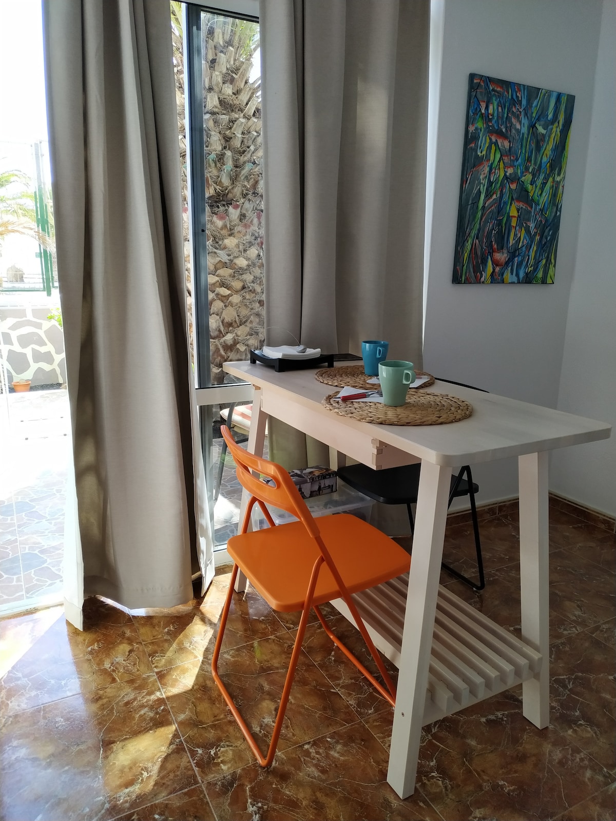 The open-plan kitchen, with an induction hob, is fully equipped with a fridge, microwave, coffee maker, and all the utensils you need to prepare delicious meals. Don't miss the opportunity to enjoy an unforgettable holiday in this charming apartment in Costa Teguise!
