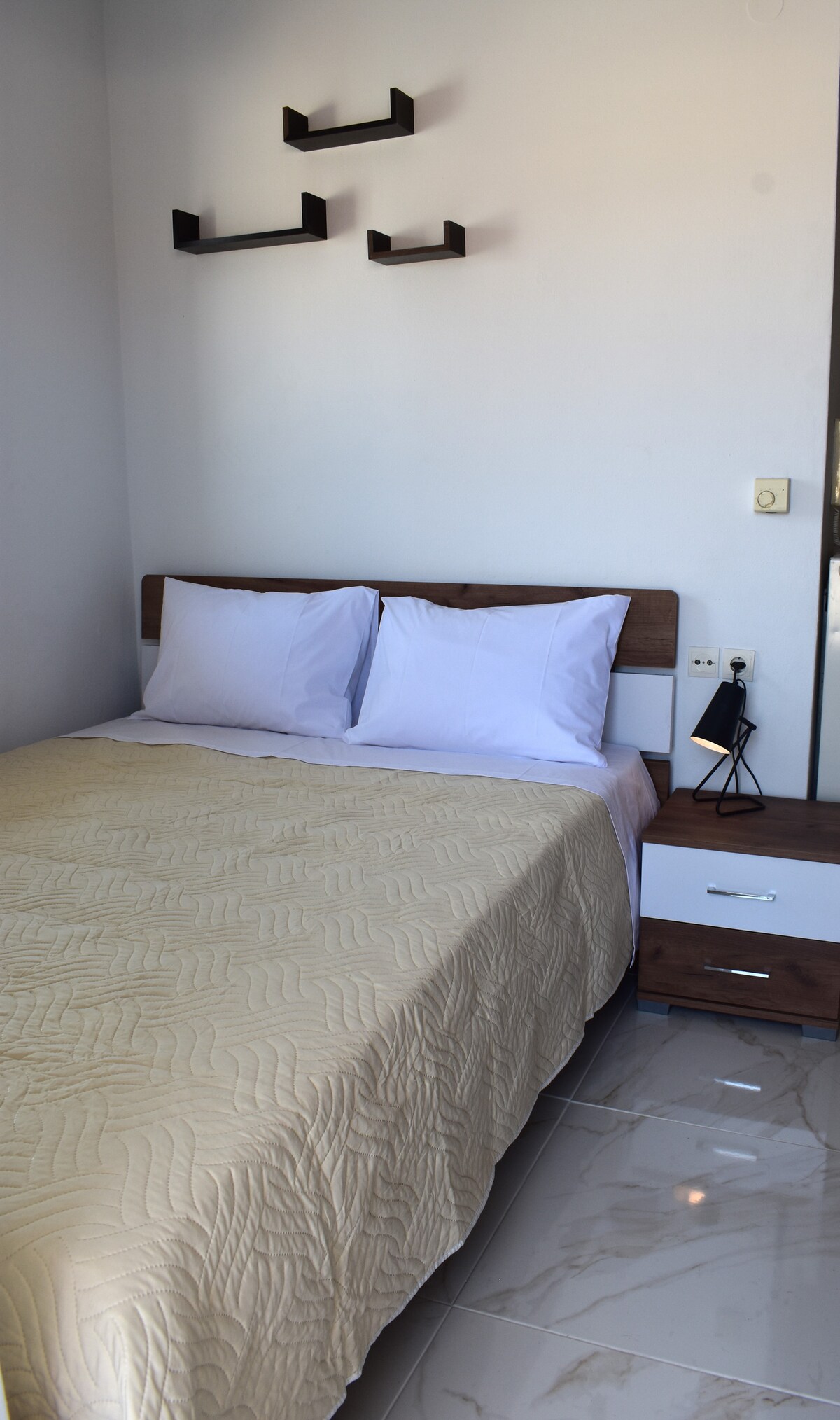 - "Melina and her family are excellent hosts. The building is laid out as a set of self contained apartments with a shared lobby, with their home being off the lobby if you need to contact them. The apartment was kept clean throughout our stay with fresh towels, etc. every 2 days. The selection of cooking equipment was good, so self-catering was a practical option, and Melina provided some olive oil, marmalade and fruit as a gift upon arrival. You will need your own condiments, kitchen roll, etc. The nearest supermarket is priced for tourists but there’s a Lidl about 5km away. Speaking of location, you’re about 5 minutes walk from the beach down a quiet street, then across a busy road at a pedestrian crossing. Close enough you wouldn’t think twice about going there and back multiple times in a day or nipping back if you’ve forgotten something. One thing to be aware of is that the apartment we had had a shower over the bath and a very low ceiling - I’m 193cm and the shower head was about level with my shoulder. If you’re tall you’ll be used to this experience but it may be worth asking whether any of the apartments are better suited for tall people."