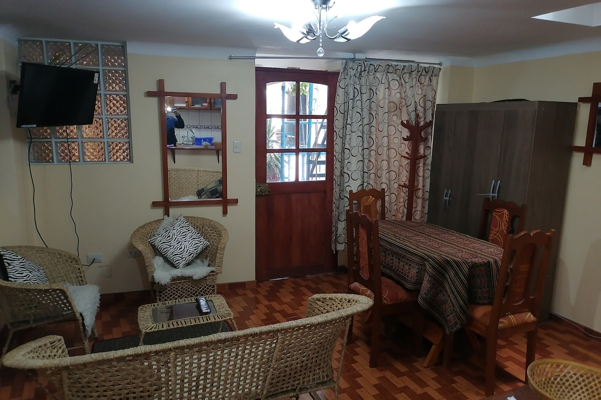 The house is located in the historic center. Cusco's Plaza de Armas is only a 10-minute walk. The San Blas neighborhood is a 5-minute walk away, where you will find market, laundry, restaurants, agencies, etc. We are also one minute away from Lucrepata Park in a residential area and with security. Enjoy the simplicity of this quiet and central accommodation, the apartment is located on the first level, we have shared areas: living room, dining room and kitchen