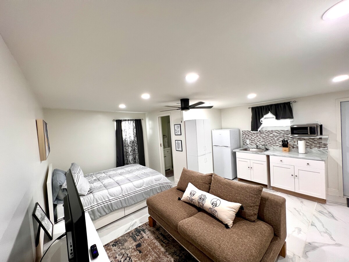 Perfect for students & professionals! This cozy, stylish studio features a private entrance, free parking, WiFi, Smart TV, and a queen bed. Enjoy a full bath, comfy couch, and fully equipped kitchenette with induction stovetop, microwave, fridge, pots, pans, and dishes. Clean, move-in ready, and ideal for short or long stays. All linens, furnishings, and essentials included—just bring your suitcase and settle in!