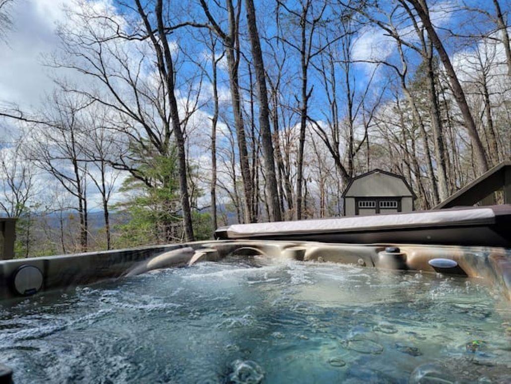 Hot tub in outside pergola. KING bed w/pillow top mattress, dining area & reading rm. Full bath w/slate shower, plush towels, bathrobes & flip flops. Kitchenette; (no oven), microwave, toaster oven, refrigerator, dishwasher, utensils, cookware & Keurig. Stocked fire pit. Private deck; outdoor living rm, gas grill overlooking a creek.50″ HDTV ROKU w/Disney, Hulu, Max, Netflix, Pandora, Paramount+, Prime & YouTube TV to name a few.